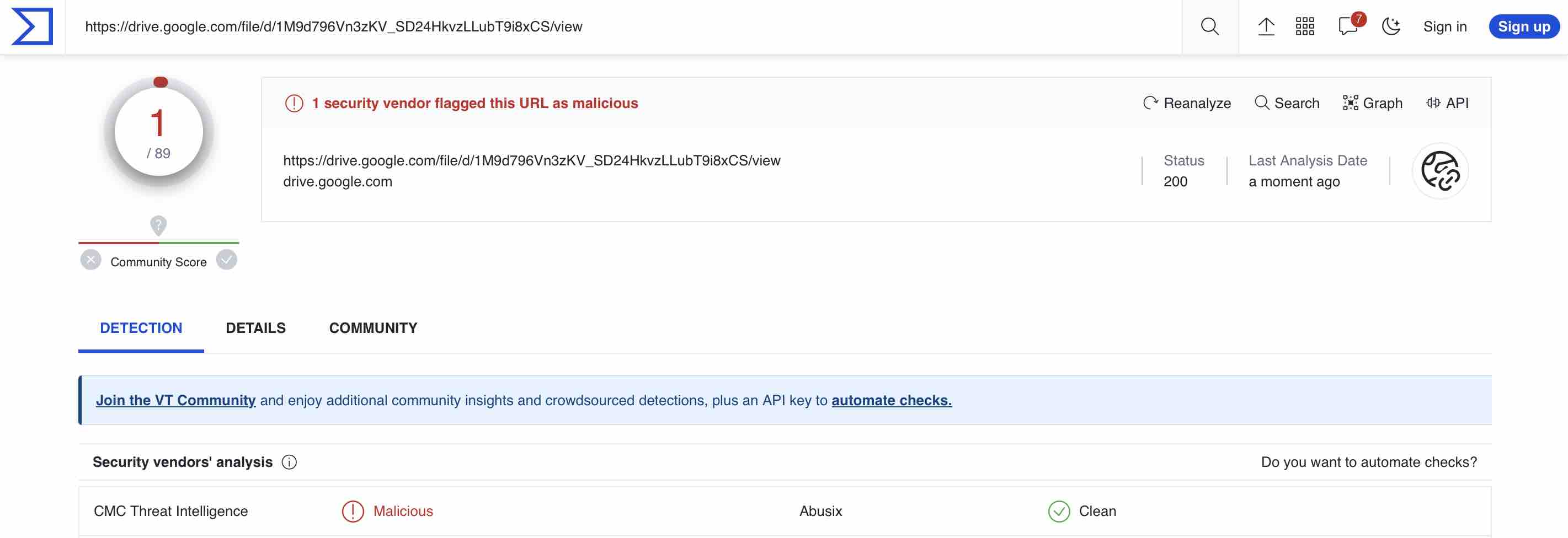 바이러스 검사 서비스를 제공하는 구글의 자회사 '바이러스토탈(VirusTotal)'에서 위 포토샵 무료 다운로드 URL을 검색해 보니, 경고 표시가 뜨는 것을 확인할 수 있었습니다.