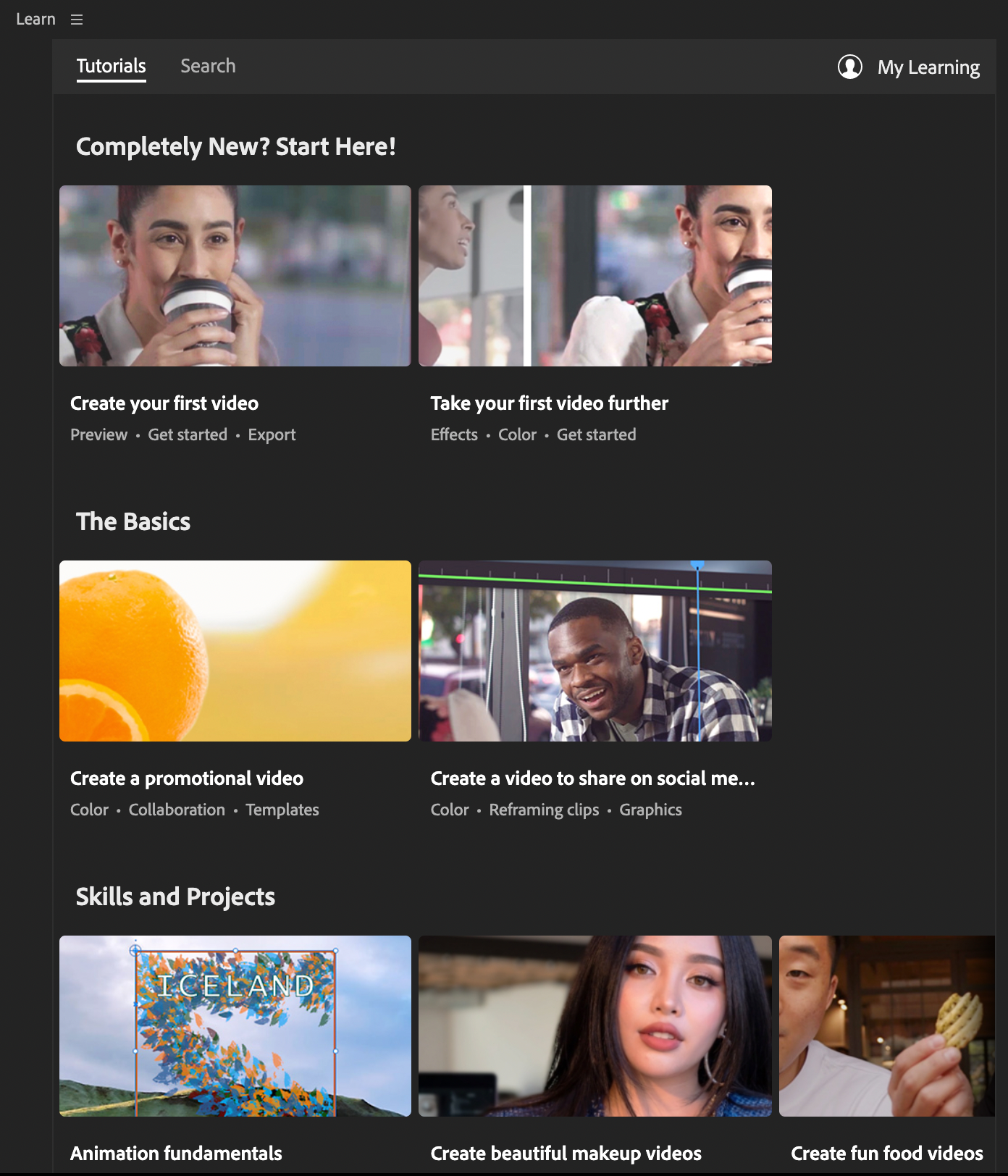 이 밖에도 아직 프리미어 프로에 익숙하지 않거나 지속적으로 추가되는 최신 기능에 대한 설명이 필요하다면, 프리미어 프로 실행 시 첫 화면에서 제공되는 튜토리얼을 참고할 수 있습니다. 또한, 어도비 코리아에서는 유튜브와 네이버 포스트를 통해서도 다양한 꿀팁 정보를 제공하고 있습니다.