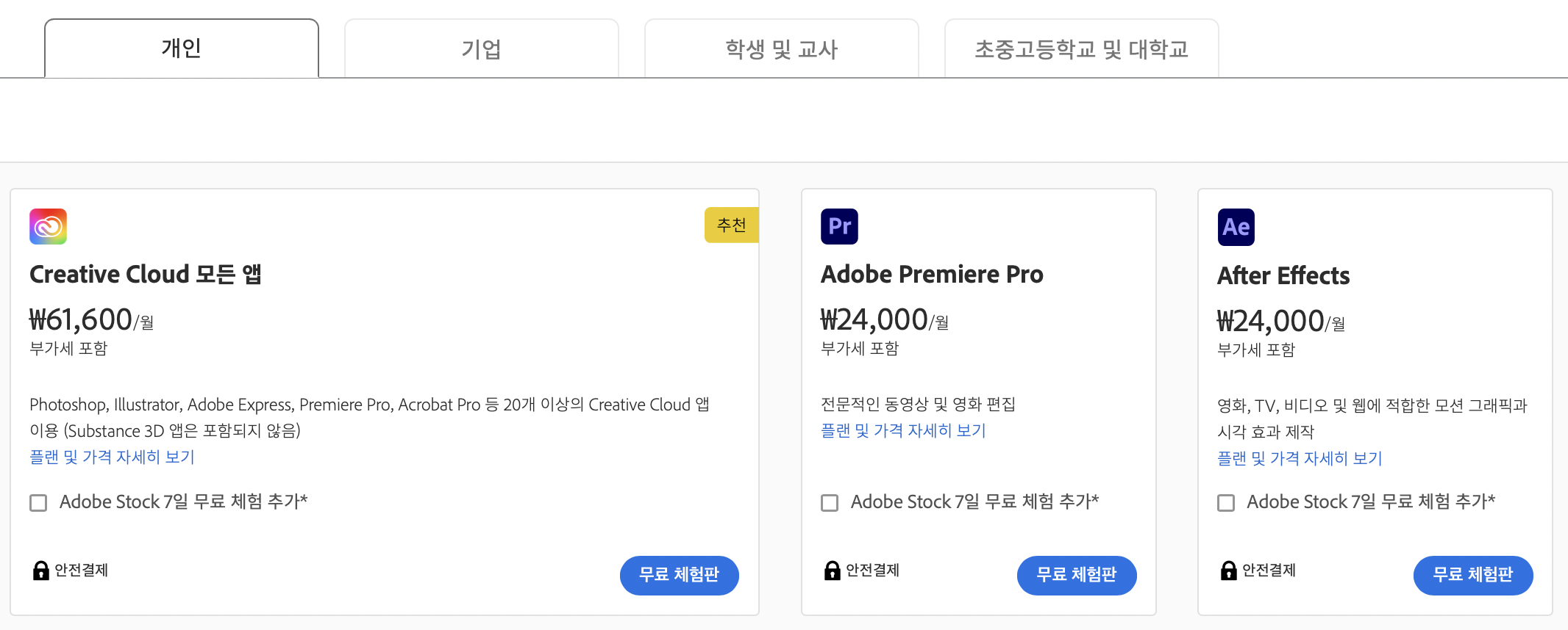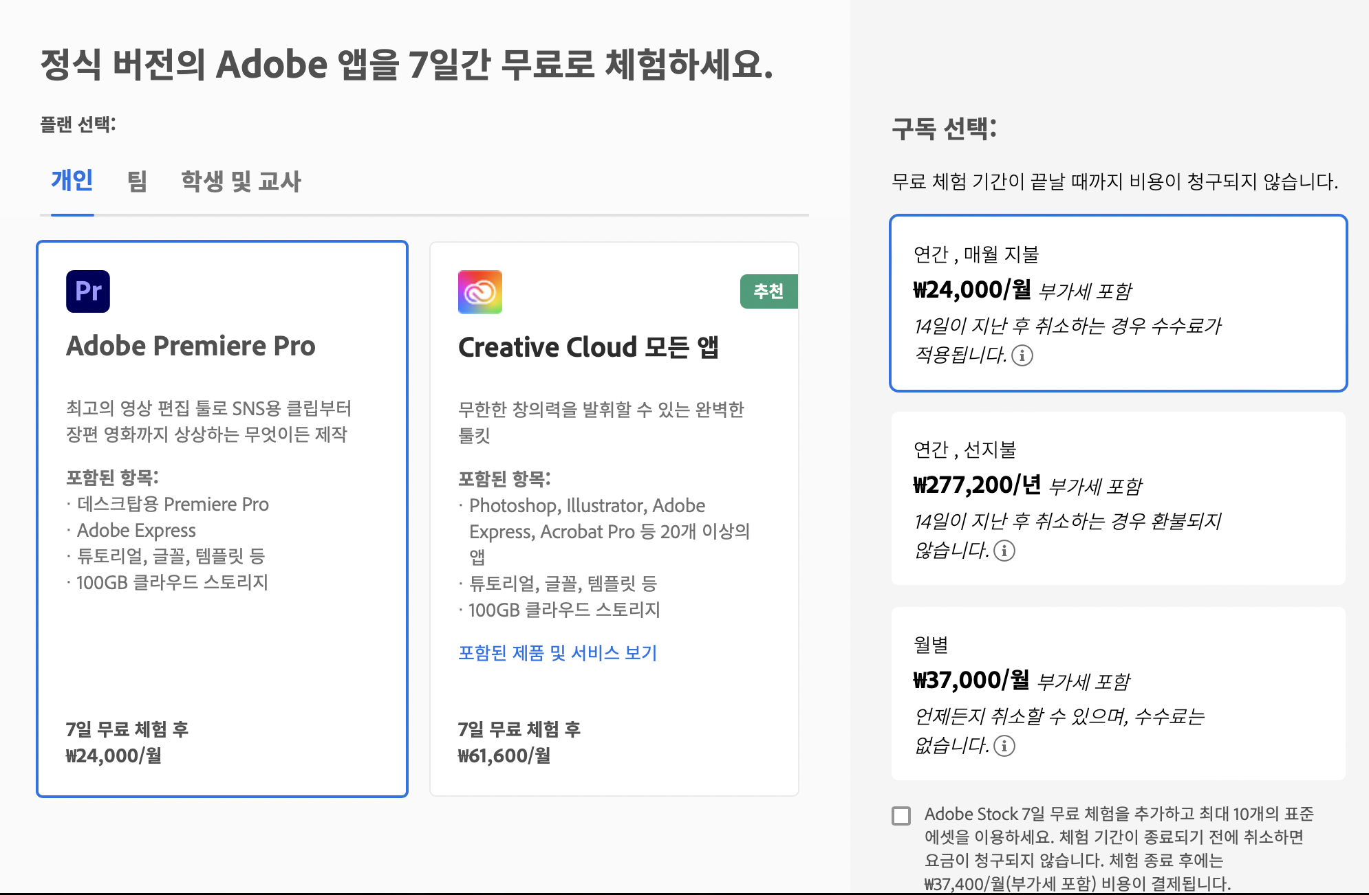 어도비는 프리미어 프로를 사용하고자 하는 사람들에게 사용자 유형별로 다양한 정기 구독 플랜을 제공합니다.