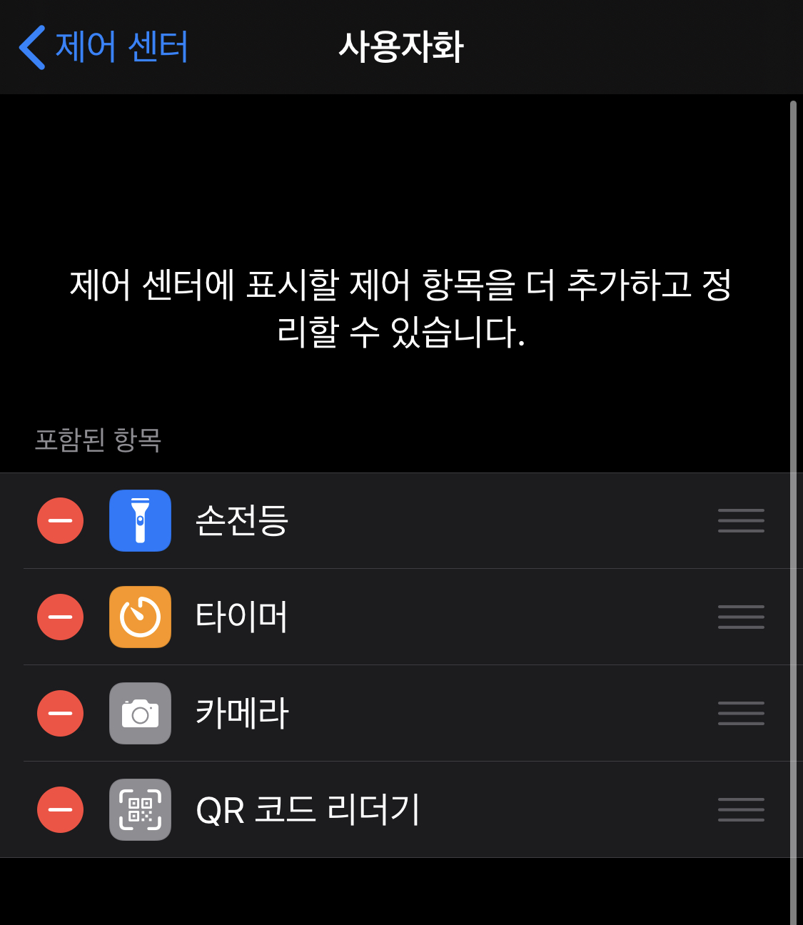 - [설정] - [제어 센터] - [제어 항목 사용자화] 메뉴에 진입합니다.