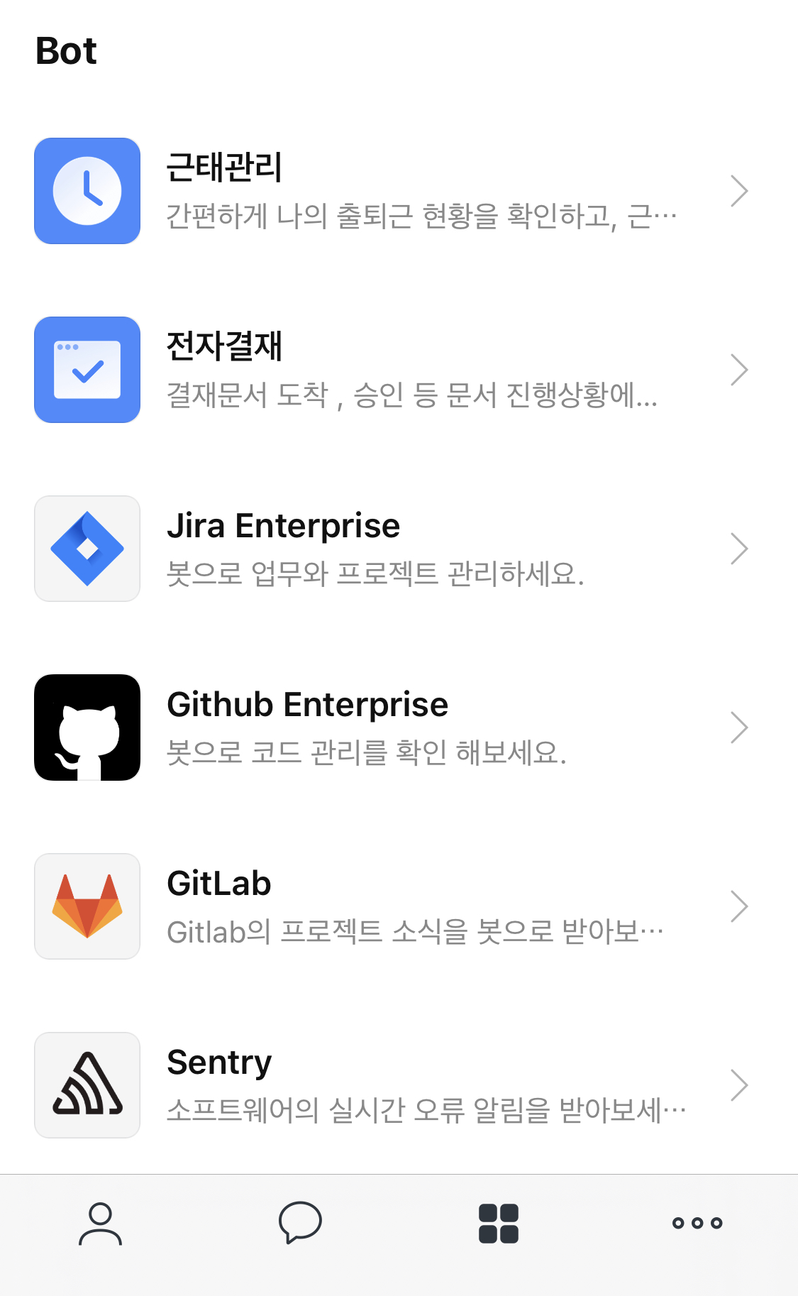 슬랙의 강점 중 하나는 봇 연동을 쉽게 할 수 있다는 점인데, 카카오워크에서도 유사한 기능이 제공됩니다. JIRA와 같은 프로젝트 관리 도구나 GitHub, GitLab과 같은 버전 관리 호스팅 서비스와 연동해서 변경 사항 등을 카카오워크 메신저로 빠르게 받아볼 수 있는 기능을 제공하고 있습니다. 슬랙에서는 매우 다양한 외부 서비스들과 연동할 수 있다는 점을 고려했을 때 한참 뒤처지는 것은 사실입니다. 하지만 기업에서 주로 사용하는 JIRA, GitHub, GitLab, Sentry와 같은 핵심 외부 서비스들에 대한 쉬운 연동 방식을 제공하고 있어서 웬만한 기업들은 큰 불편함 없이 사용할 수 있다는 점과 더불어, 라인 웍스가 봇 기능을 제공하고는 있지만 쉬운 외부 서비스 연동 기능을 제공하고 있지 않다는 점에서 이는 카카오워크의 강점이 될 것으로 보입니다.