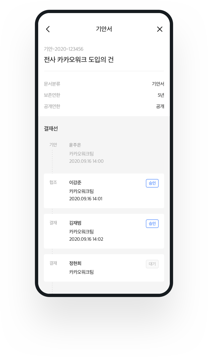 카카오톡에서 사용하던 이모티콘을 연동해서 사용할 수 있다는 점 또한 좋았습니다. 라인 웍스에서는 기본 제공되는 스티커만 사용할 수 있다는 점과 비교하면 분명한 장점입니다.(대신 라인 웍스에 기본 제공되는 스티커의 종류는 매우 많습니다.) 또한 라인 웍스가 라인 캐릭터를 활용한 업무 커뮤니케이션에 특화된 스티커(인사, 승낙, 거절 등)를 만들어서 사용하고 있는 것처럼, 카카오워크에서도 카카오 캐릭터들을 활용한 특화 이모티콘이 존재합니다. 다만 이 이모티콘 기능은 업무 시의 생산성을 높여 주는 기능이라기 보다는 부드러운 커뮤니케이션을 위한 부가 기능에 불과하기 때문에 카카오워크의 특장점으로 내세울 수 있을지는 의문입니다.
