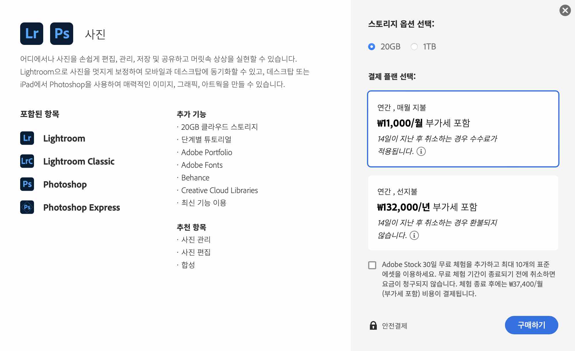 저는 개인적으로 위의 플랜들 중에서 '포토그래피 플랜 (20GB)'을 추천합니다.