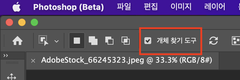 그리고 포토샵 화면 위에서 ‘개체 찾기 도구’가 체크된 것을 확인합니다.
