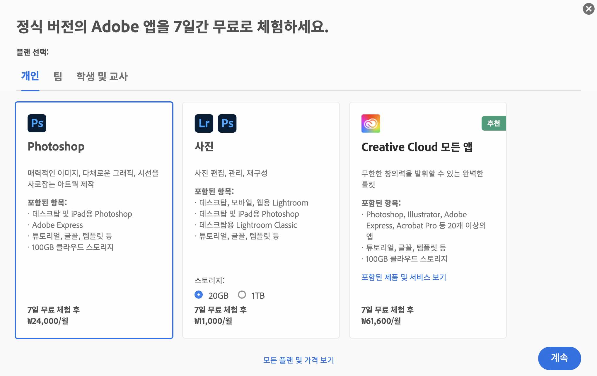 어도비는 포토샵을 사용하고자 하는 사람들에게 사용자 유형별로 다양한 플랜을 제공합니다.