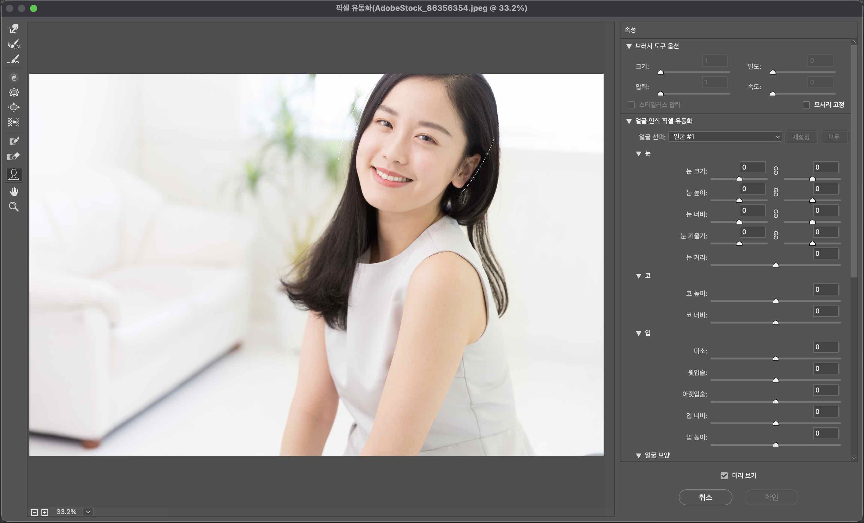 ‘픽셀 유동화’ 기능을 사용하면 세부 수치를 조정하여 얼굴에 변화를 줄 수 있습니다.