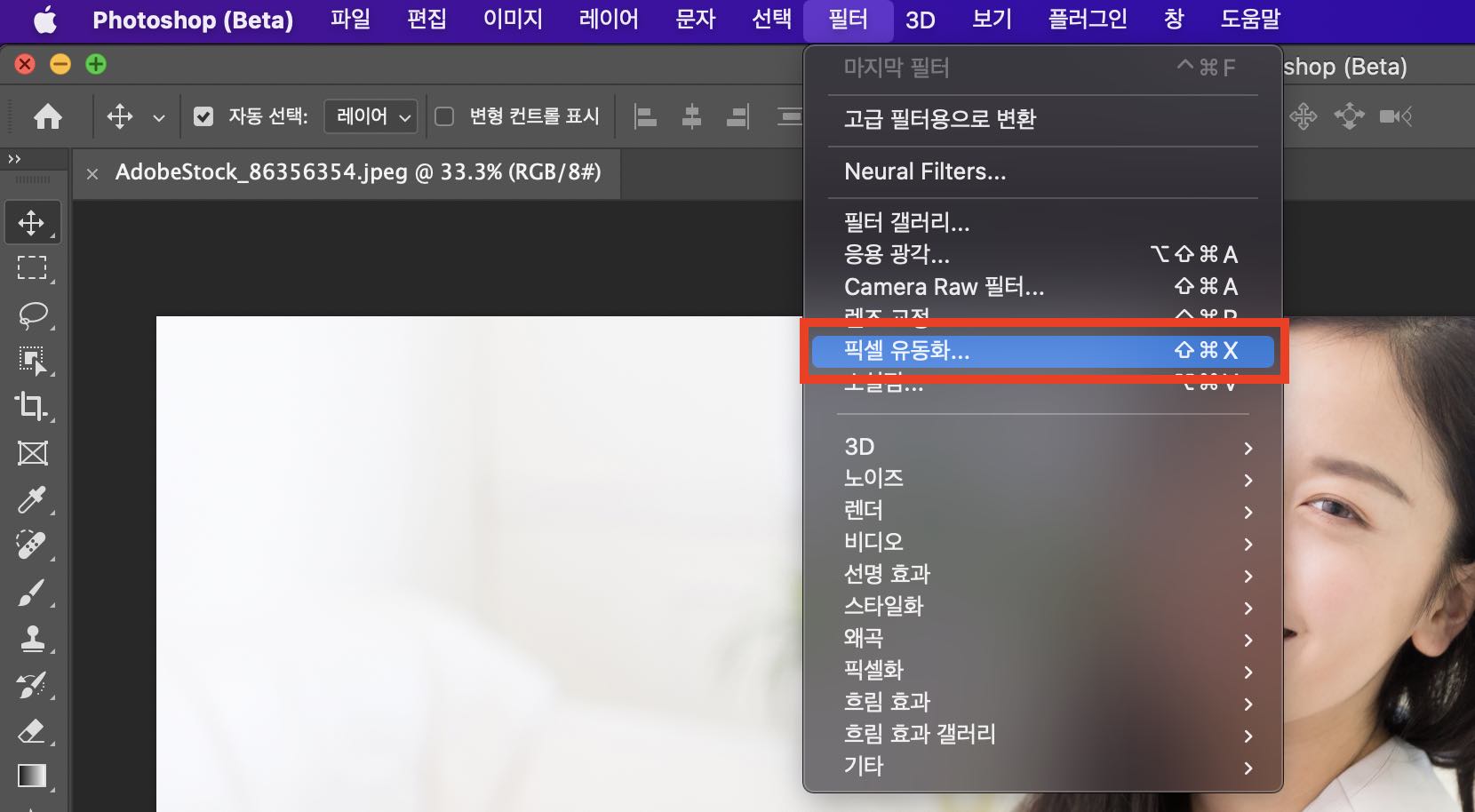 그렇다면 이제 ‘픽셀 유동화’ 기능을 사용해 보겠습니다.