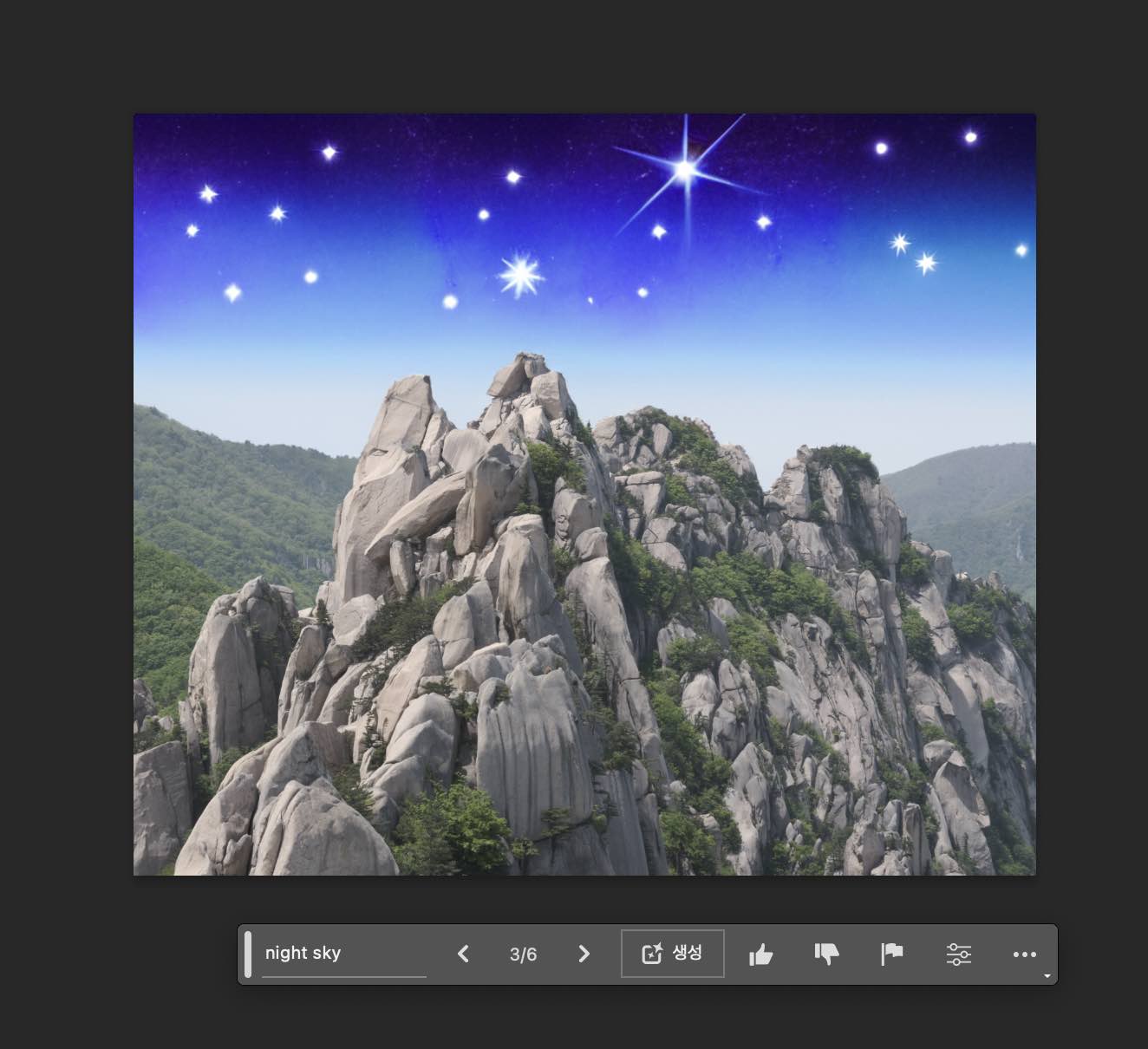 ‘생성형 채우기’ 버튼을 누르고 텍스트 프롬프트에 ‘night sky’를 입력하고 ‘생성’ 버튼을 눌러 보겠습니다.
