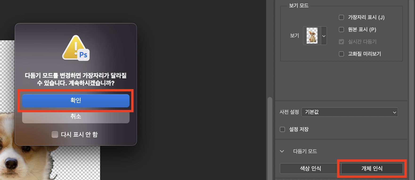 [다듬기 모드]-[개체 인식]을 선택하고, 팝업창이 뜨면 [확인] 버튼을 선택합니다.
