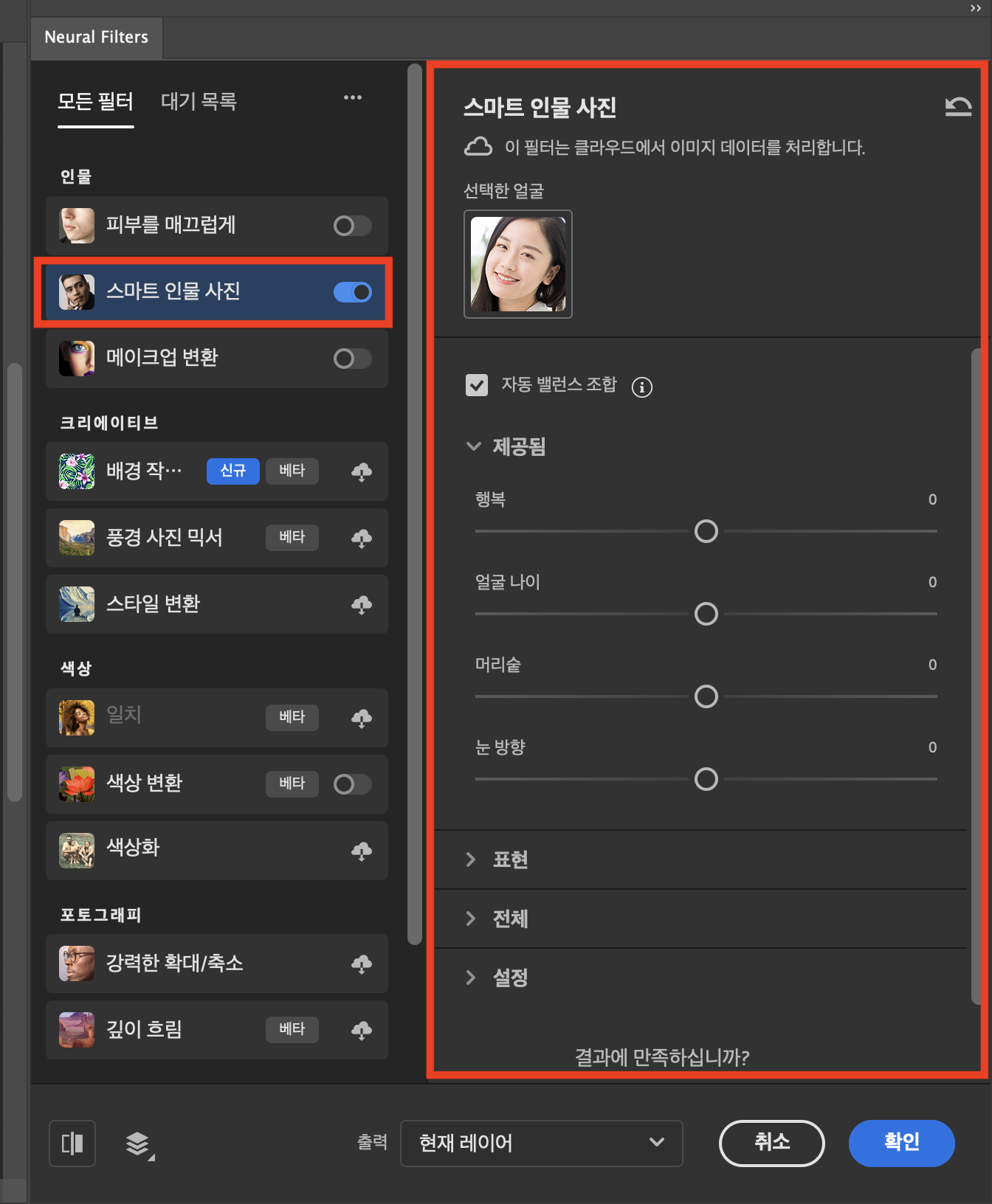 인물의 표정을 바꾸고자 한다면, 아래와 같이 ‘스마트 인물 사진 필터’를 활성화합니다.