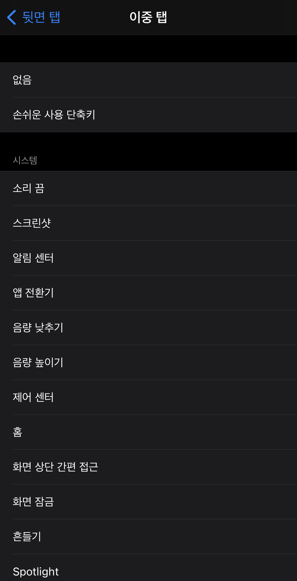 이 메뉴에 들어가면 [이중 탭], [삼중 탭하기]라는 항목이 있습니다. 각각 두 번 탭했을 때와, 세 번 탭했을 때에 대한 동작을 설정할 수 있습니다.