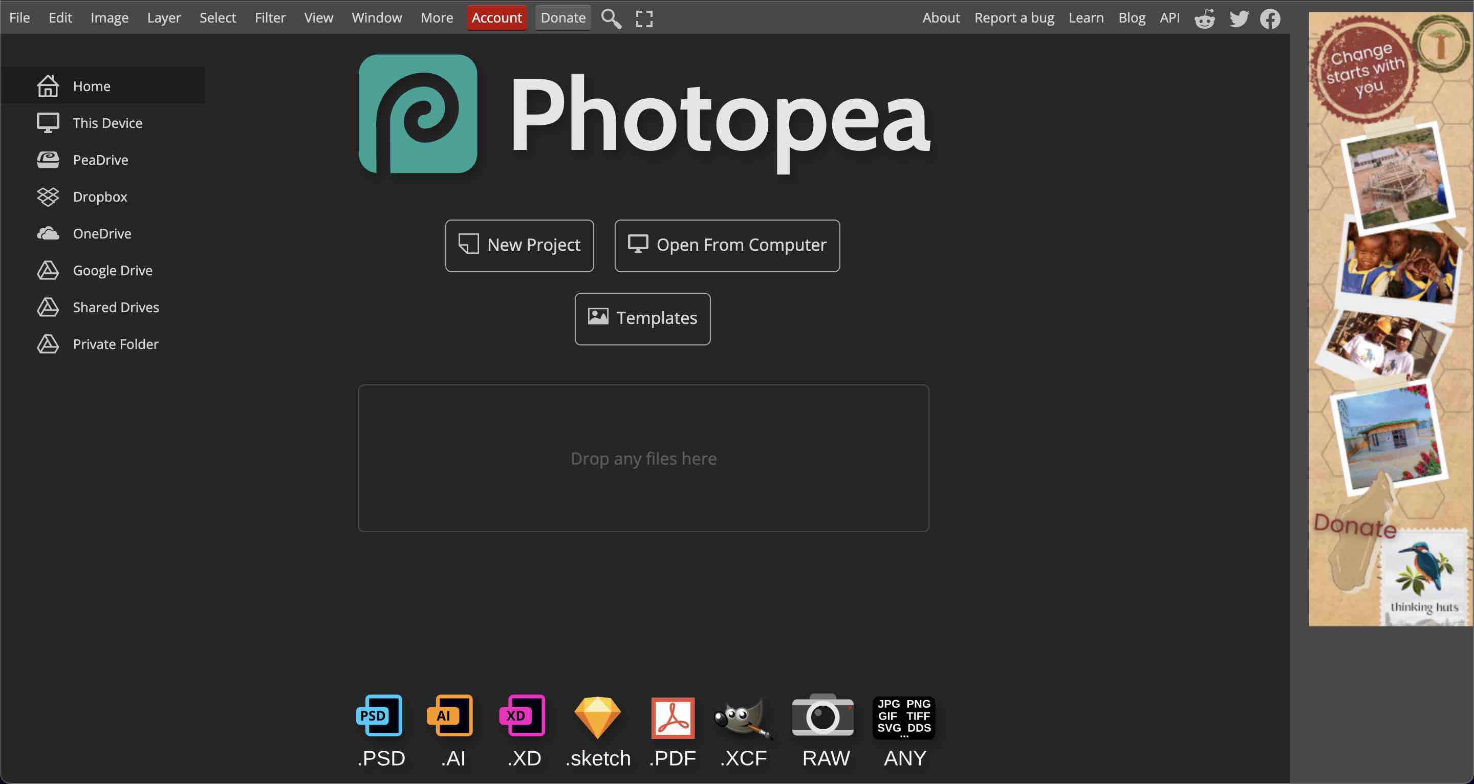 ✕ Photopea: advanced photo editor Free online photo editor supporting PSD, XCF, Sketch, XD and CDR formats. (Adobe Photoshop, GIMP, Sketch App, Adobe XD and CorelDRAW). Create a new image or open existing files from your computer. Save your work as PSD (