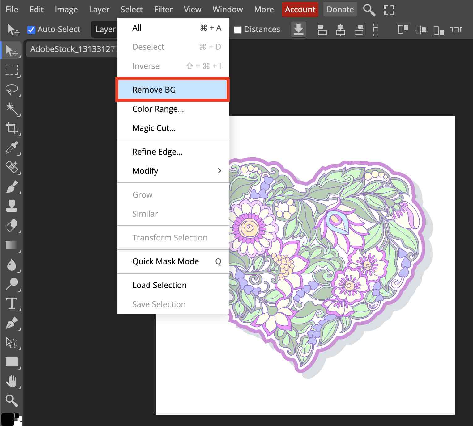 상단 메뉴에서 [Select]-[Remove BG] 메뉴를 클릭합니다.