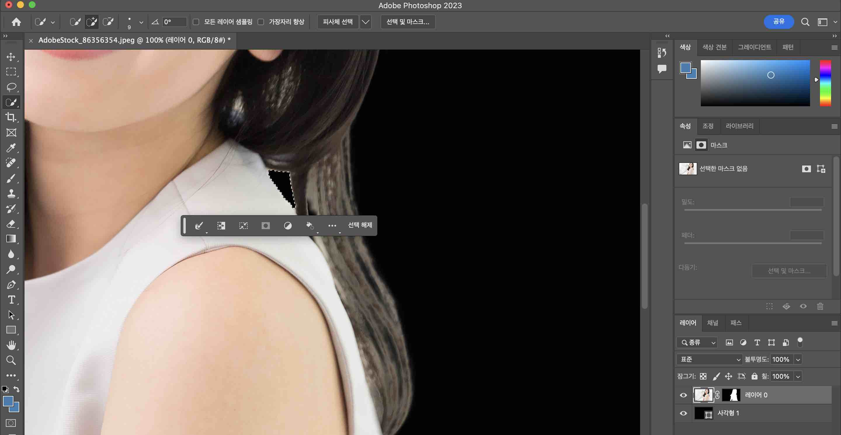 어깨 부분에 배경이 약간 남아 있지만, 브러쉬 툴을 사용하여 제거하면 될 것으로 보입니다.