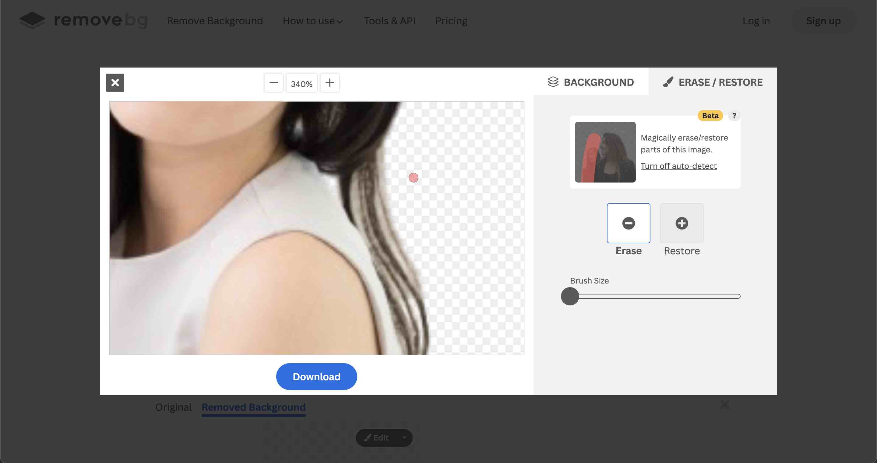 어깨 부분에 배경이 남아 있지만, Remove.bg 서비스도 브러쉬 툴 기능을 제공하므로 세부 수정을 할 수 있습니다.