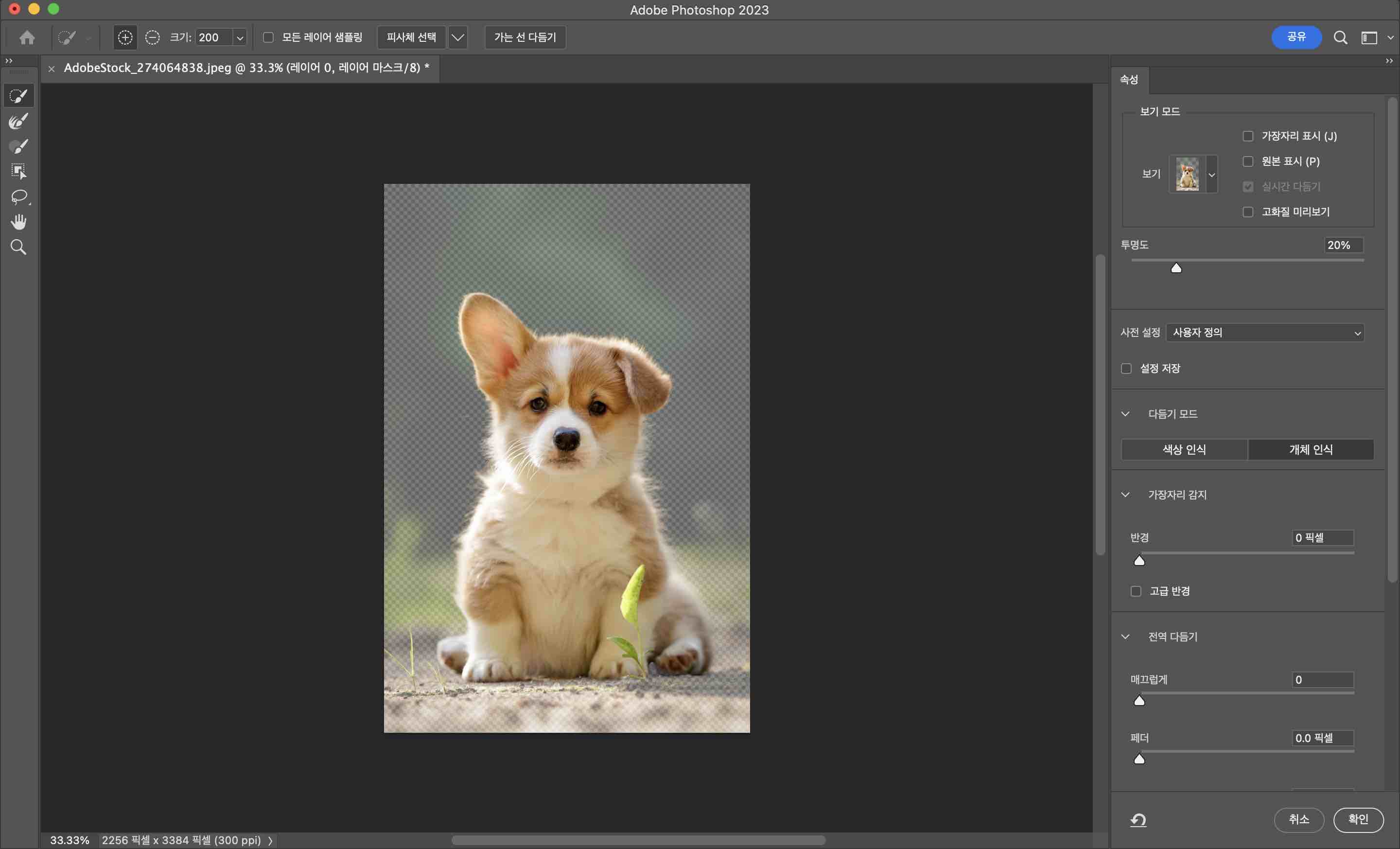 그렇다면 [가는 선 다듬기] 기능을 사용하여 강아지의 털을 더 정교하게 누끼를 따 보겠습니다.