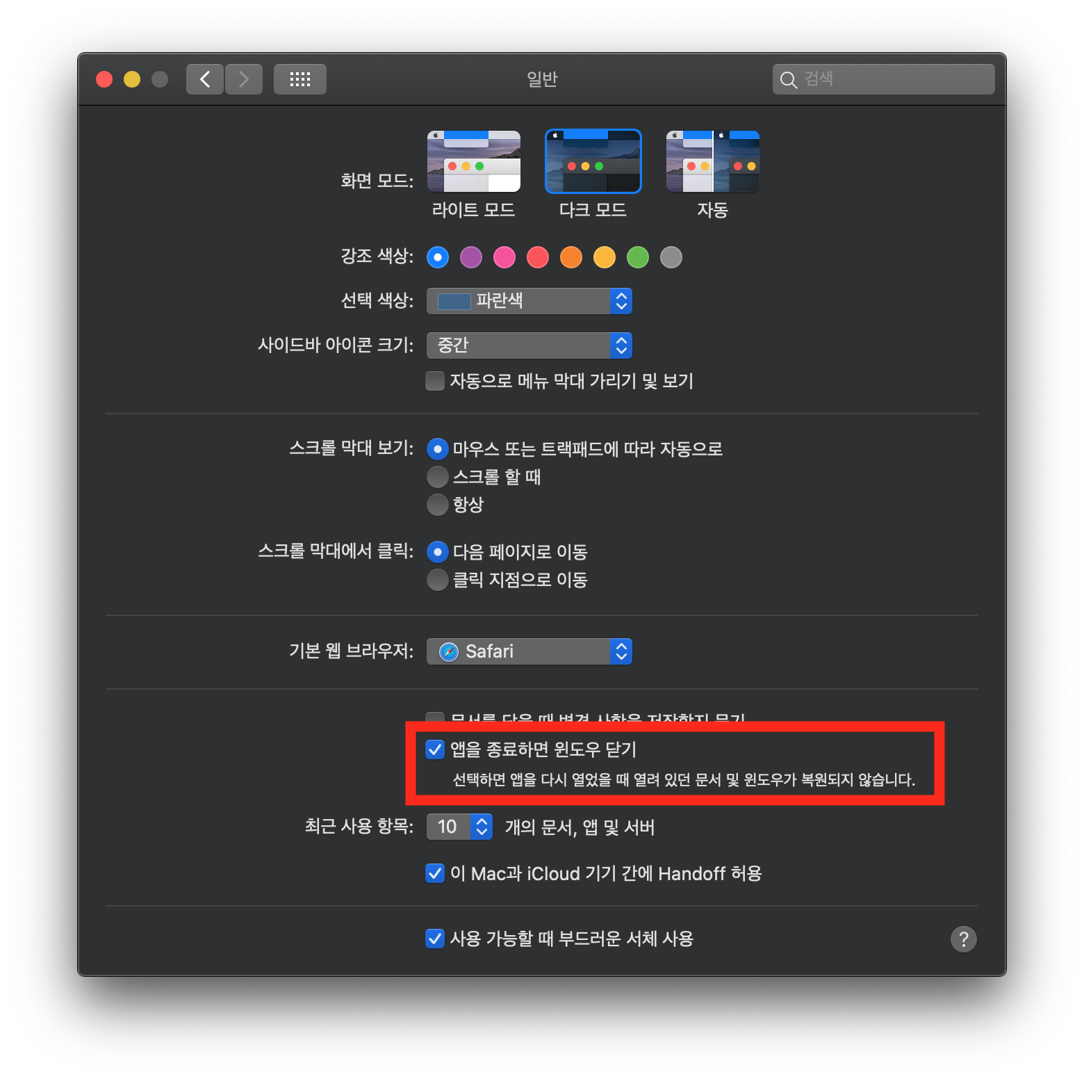 [시스템 환경설정] - [일반]에 위치한 이 옵션을 비활성화하게 되면*, 앱을 종료(단축키: 커맨드-Q)했다가 다시 열 때 기존에 작업하던 세션이 복원됩니다.(앱이 지원하는 경우에 한함) 사파리를 예로 들면, 이 설정을 비활성화하는 경우 사파리 종료 후에 사파리를 다시 실행시켰을 때 종료 직전에 열려 있던 탭들이 복원됩니다. 앱을 실수로 종료하는 경우나 맥 사용을 종료하기 전에 항상 모든 앱을 종료하는 분들에게 유용합니다. 특히 사파리의 경우, '개인 정보 브라우징' 탭들까지 종료 직전으로 복원**해 주기 때문에 상황에 따라서는 굉장히 유용한 설정이 될 수 있습니다.***
