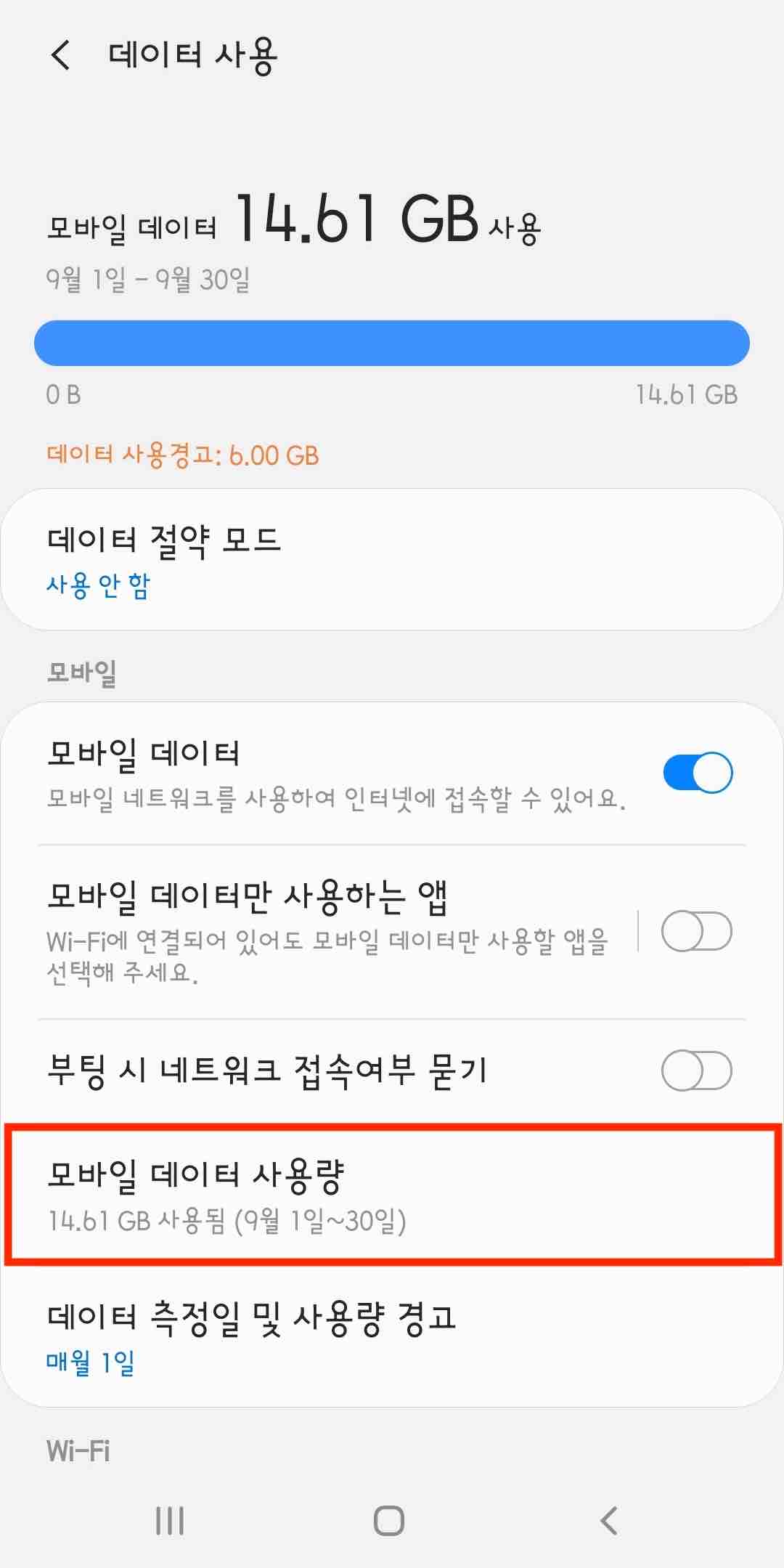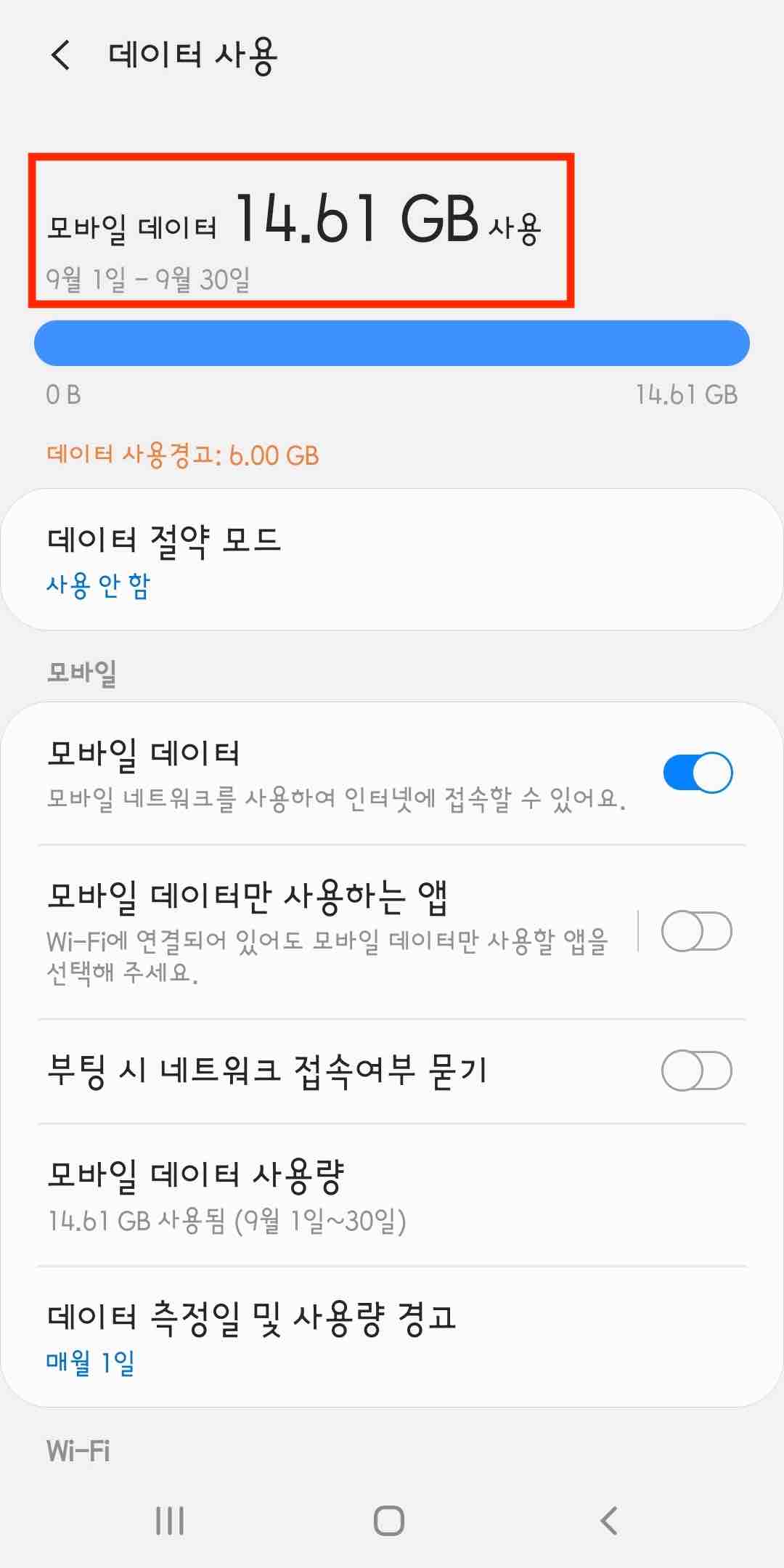 필자는 9월 1일부터 현재까지 약 14.6GB의 모바일 데이터를 사용한 것을 알 수 있습니다.