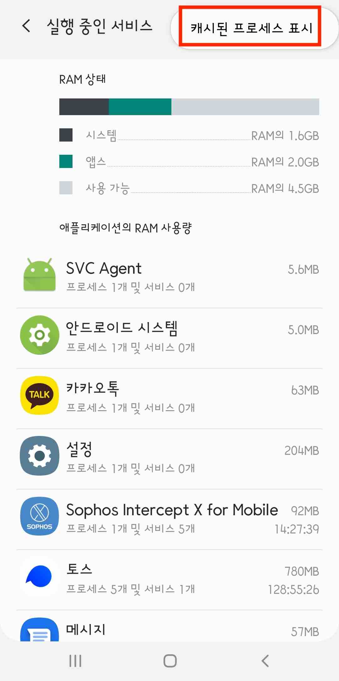 [캐시된 프로세스 표시]를 선택하면 말 그대로 캐시된 프로세스를 확인할 수 있습니다.