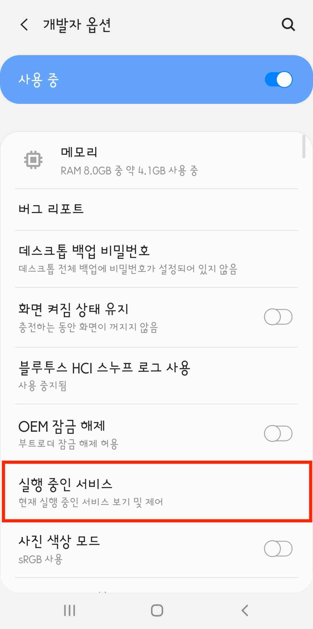 [개발자 옵션] 메뉴에서 [실행 중인 서비스]를 선택합니다.