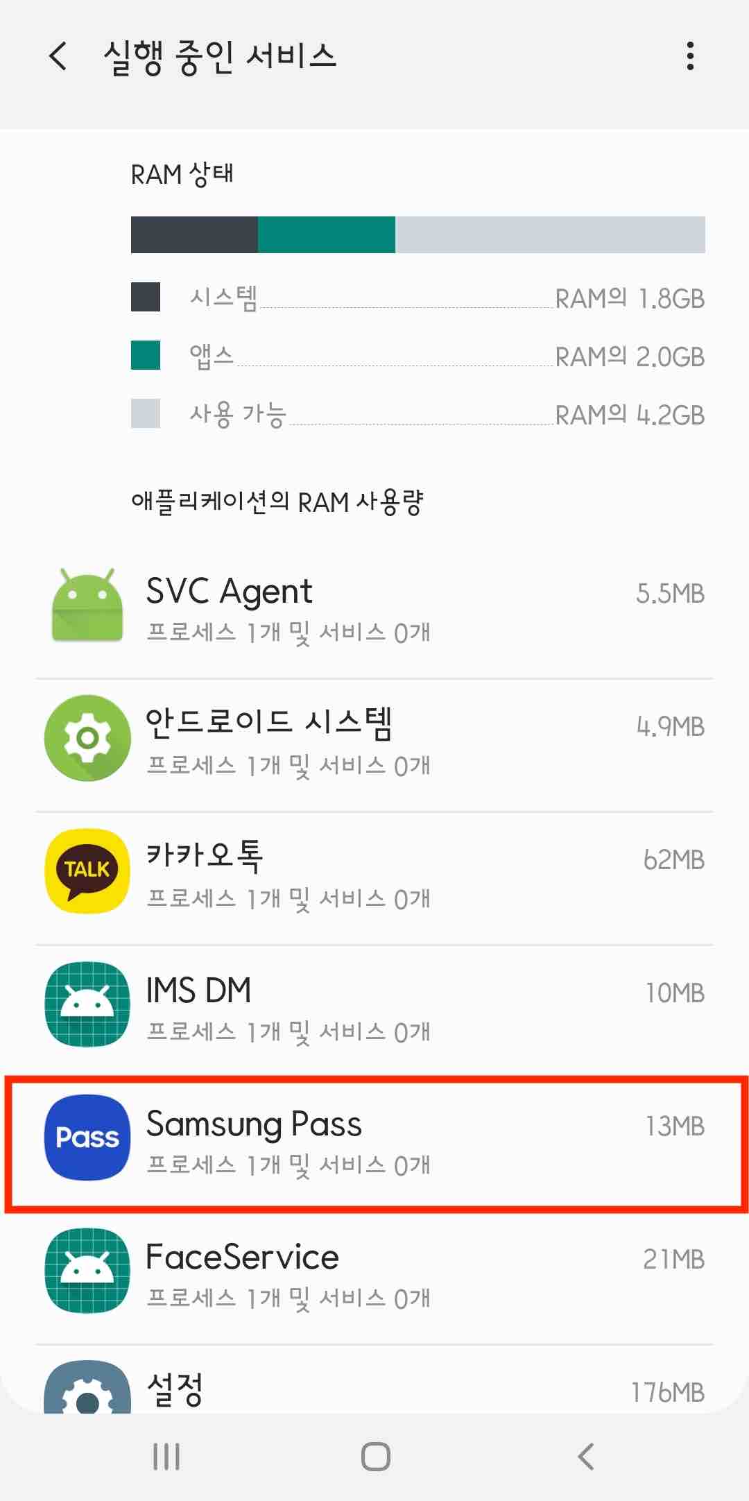 현재 실행 중인 서비스를 확인할 수 있습니다. 실행 중인 서비스가 많을수록 메모리(램)를 많이 차지하게 됩니다.