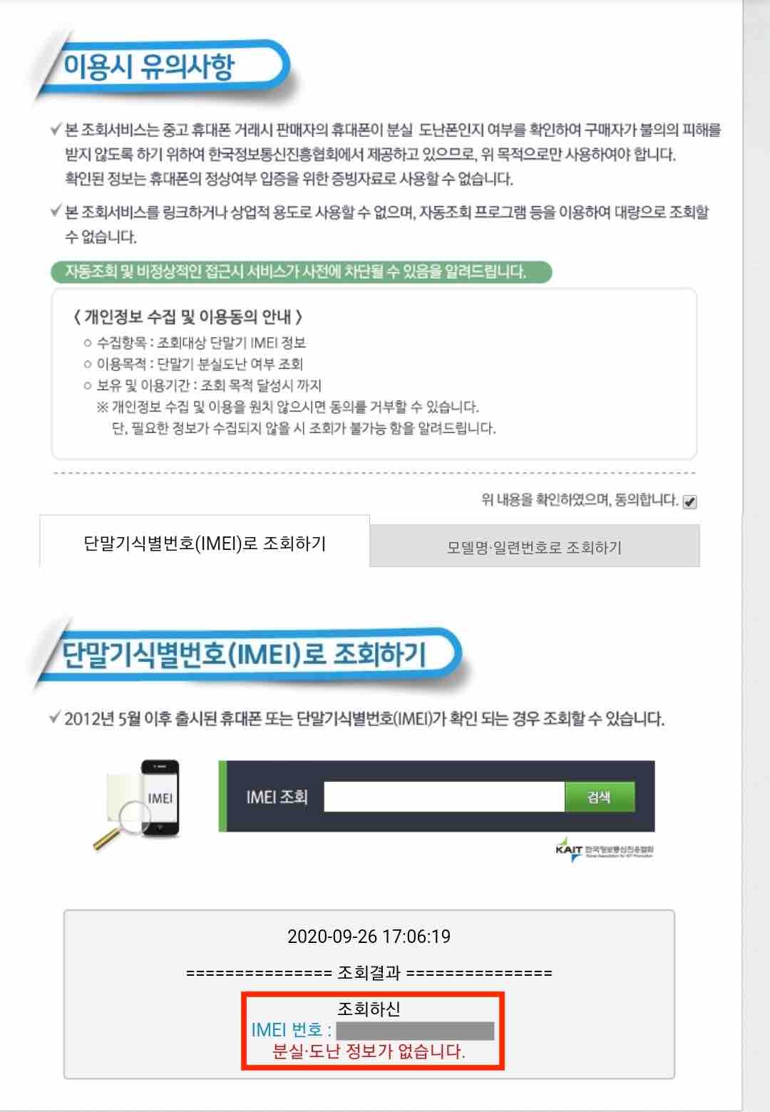 만약 기기 정보에 이상이 없다면 다음과 같이 '분실, 도난 정보가 없습니다.'라고 표시됩니다.
