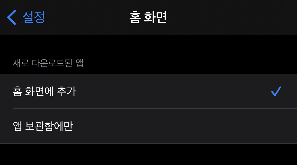 설치한 앱이 보이지 않는다면, 앱 보관함 메뉴에 들어간 뒤 해당되는 앱을 찾아서 드래그 후 홈 화면에 배치하면 됩니다. 그 이후, 설정에서 [홈 화면] 메뉴의 [새로 다운로드된 앱] 섹션의 옵션을 [홈 화면에 추가]로 바꿔주면 신규 설치되는 앱들은 이제 홈 화면에도 표시되게 됩니다.