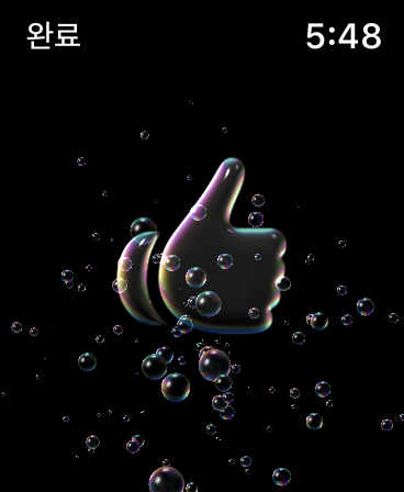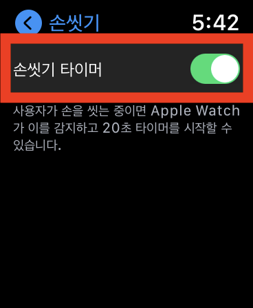 손씻기 타이머 기능은 사용자가 손을 씻기 시작할 때 애플 워치가 이를 자동으로 감지*해서 타이머를 작동시키는 역할을 합니다. 타이머의 시간은 20초이며 타이머의 남은 시간이 비누 거품 모양으로 표시됩니다. 만약 사용자가 타이머 작동 도중 움직임을 잠시 멈추면 타이머의 시간도 이에 맞춰서 멈추게 됩니다. 타이머가 끝날 때까지 손씻기를 지속한다면 타이머의 시간이 👍 모양으로 바뀌면서 손씻기는 종료됩니다. 만약 타이머가 끝나기 전에 손씻기를 끝낸다면 타이머는 몇 초 후에 스스로 종료됩니다.
