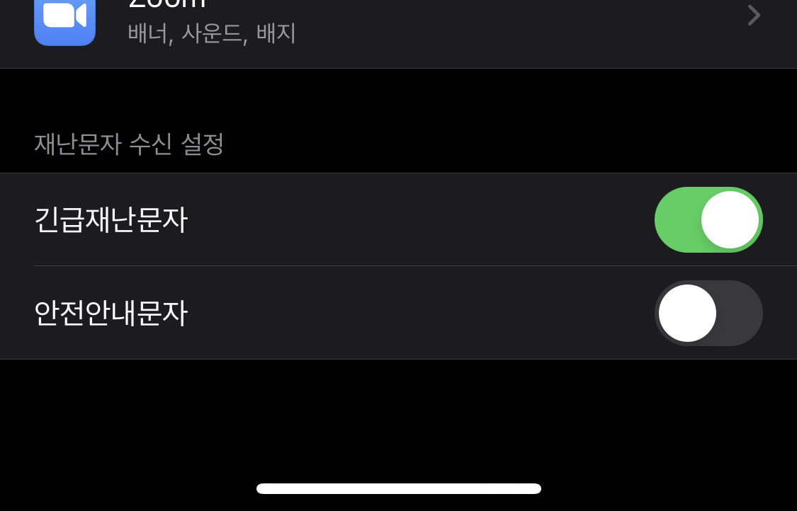 2. [알림] 메뉴에서 스크롤을 내리면 가장 아래에 [재난문자 수신 설정] 섹션이 있습니다. 여기서 수신하고자 하는 메시지만 선택적으로 알림을 켜거나 끕니다.