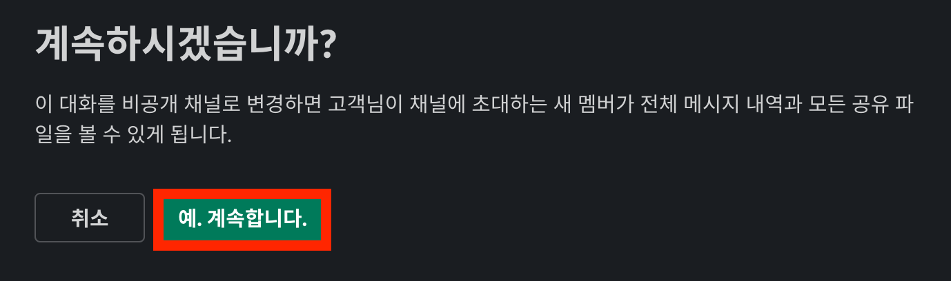 4. 채널로 변경하면 이후 초대되는 다른 사용자가 내역을 볼 수 있다는 경고 문구가 표시됩니다. [예. 계속합니다.] 버튼을 누릅니다.