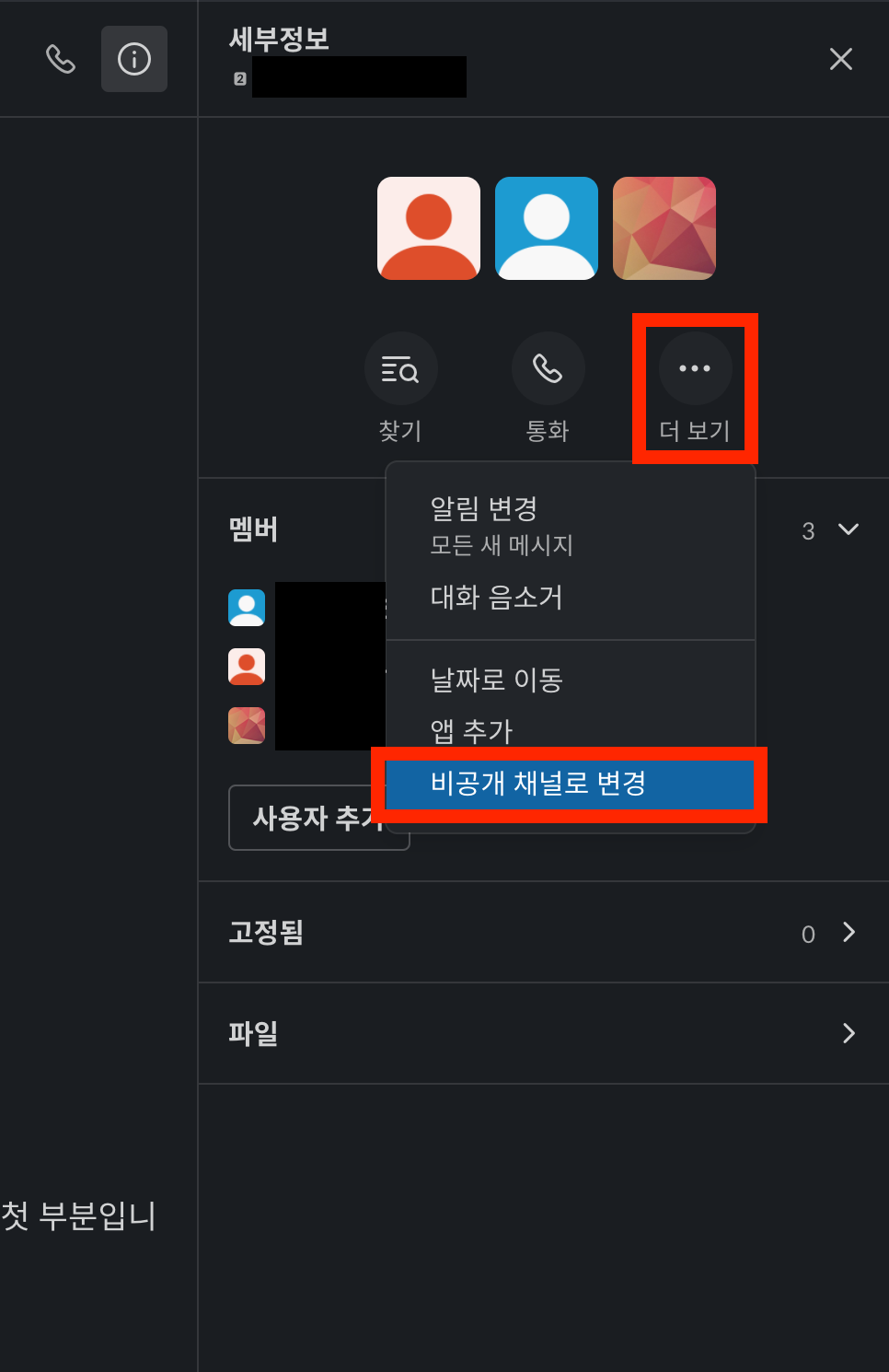 3. 표시된 메뉴에서 [비공개 채널로 변경] 버튼을 누릅니다.