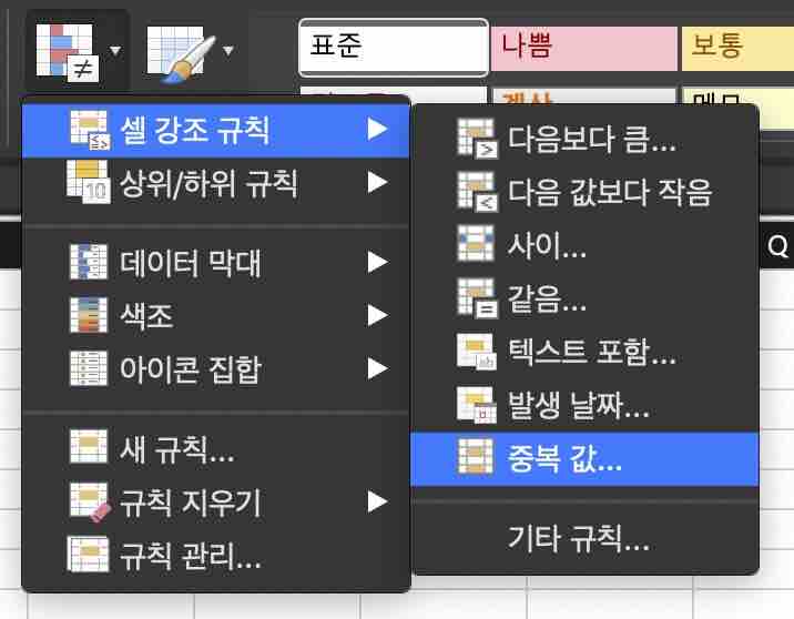 상단 메뉴에서 [조건부 서식] > [셀 강조 규칙] > [중복 값]을 선택합니다.