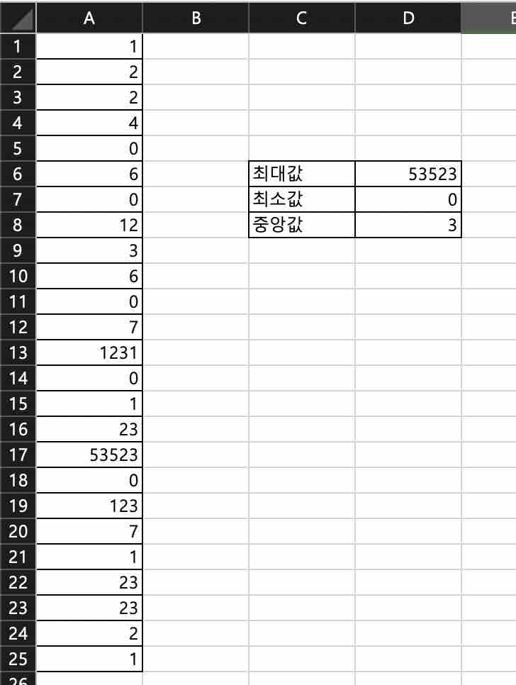 총 25개의 숫자들을 대상으로 최대값, 최솟값, 중앙값을 구해 보겠습니다.