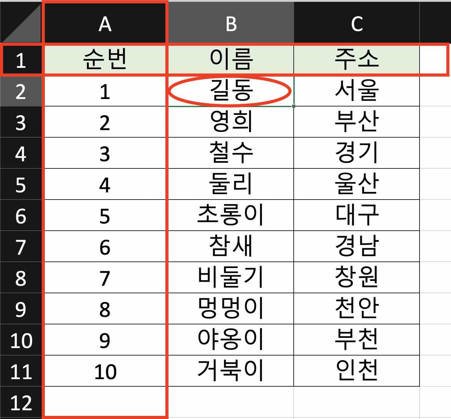 아래 예제 테이블에서 A열과 1행을 고정해 보겠습니다. A열의 오른쪽과 1행의 아래에 있는 셀인 '길동' 셀을 선택하고, 상단 메뉴에서 [보기(View)]를 누른 뒤 [틀 고정(Freeze Panes)]을 누르면 됩니다.
