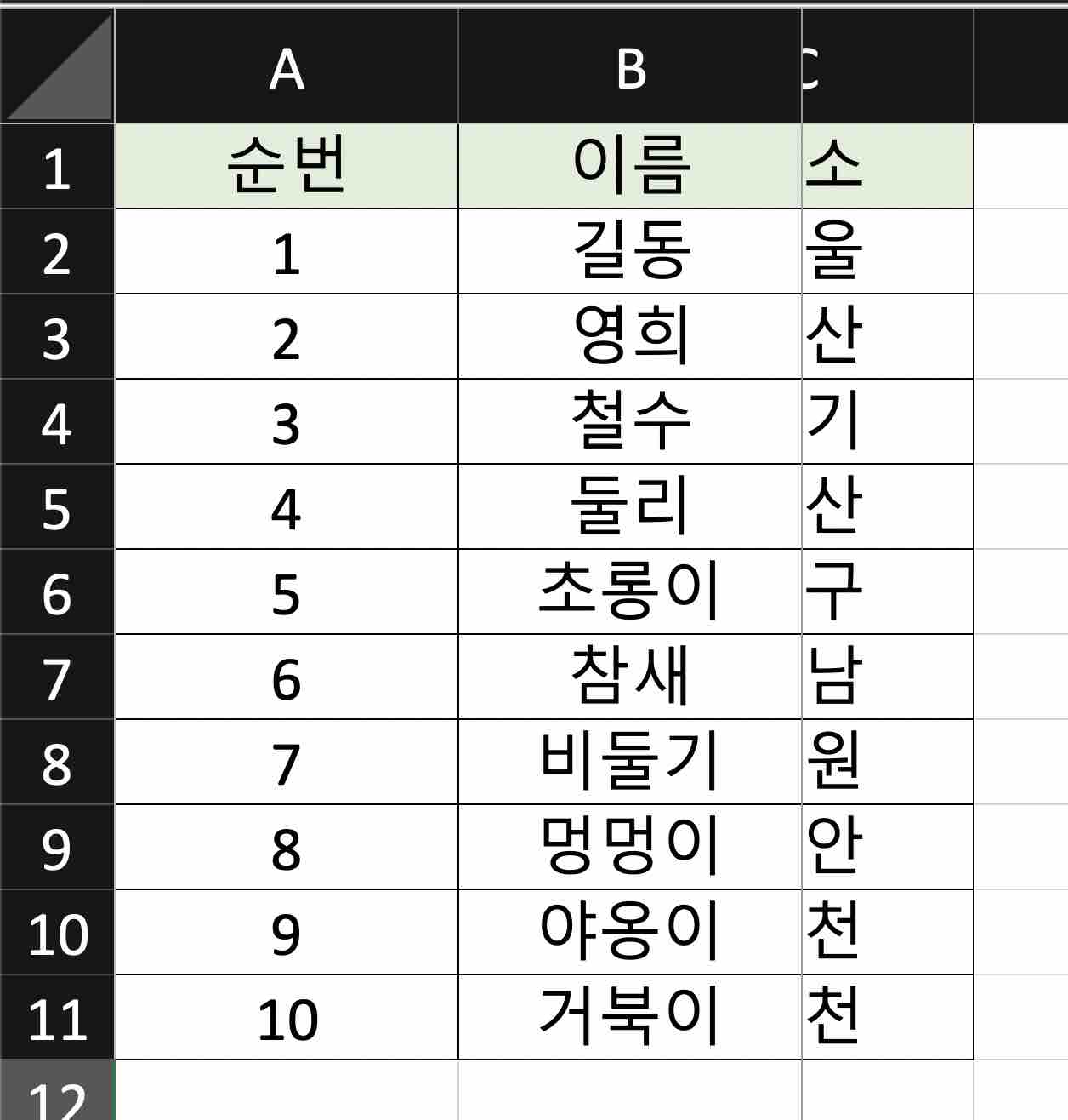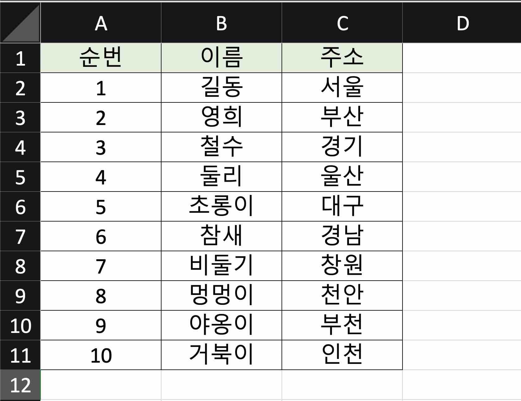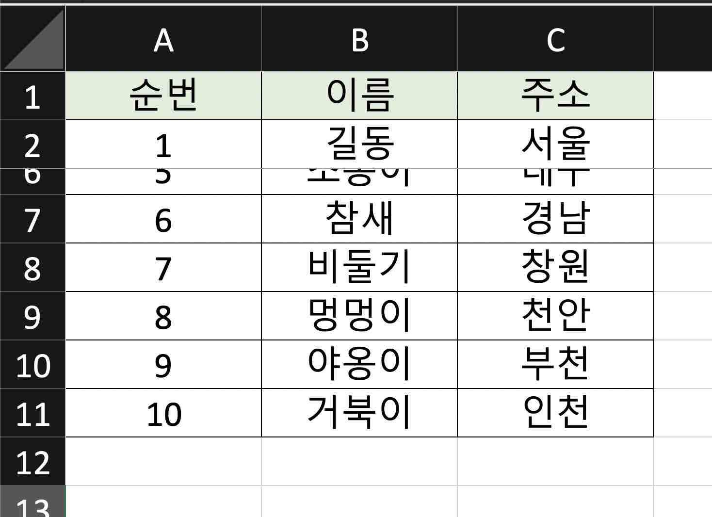 아래 예제용 테이블을 사용하여 틀 고정 기능을 익혀 보겠습니다.