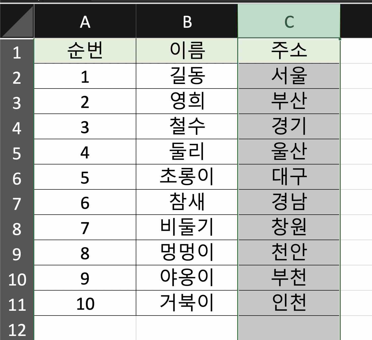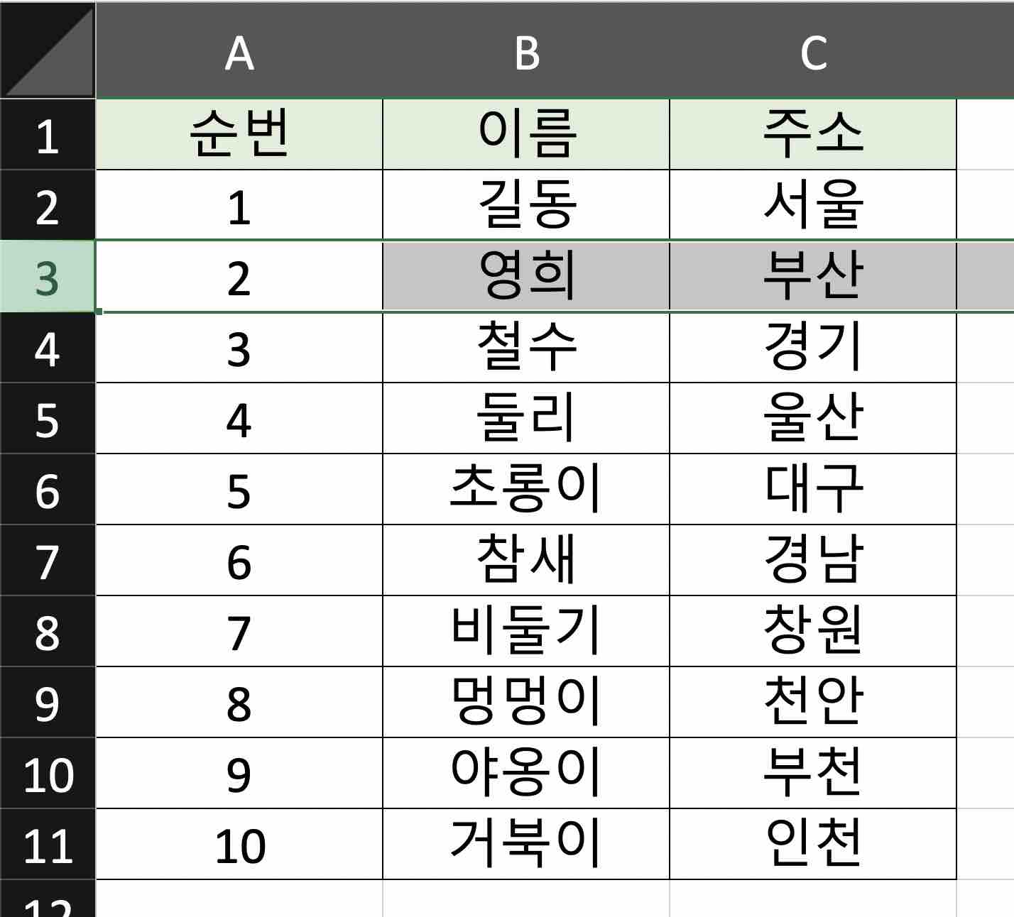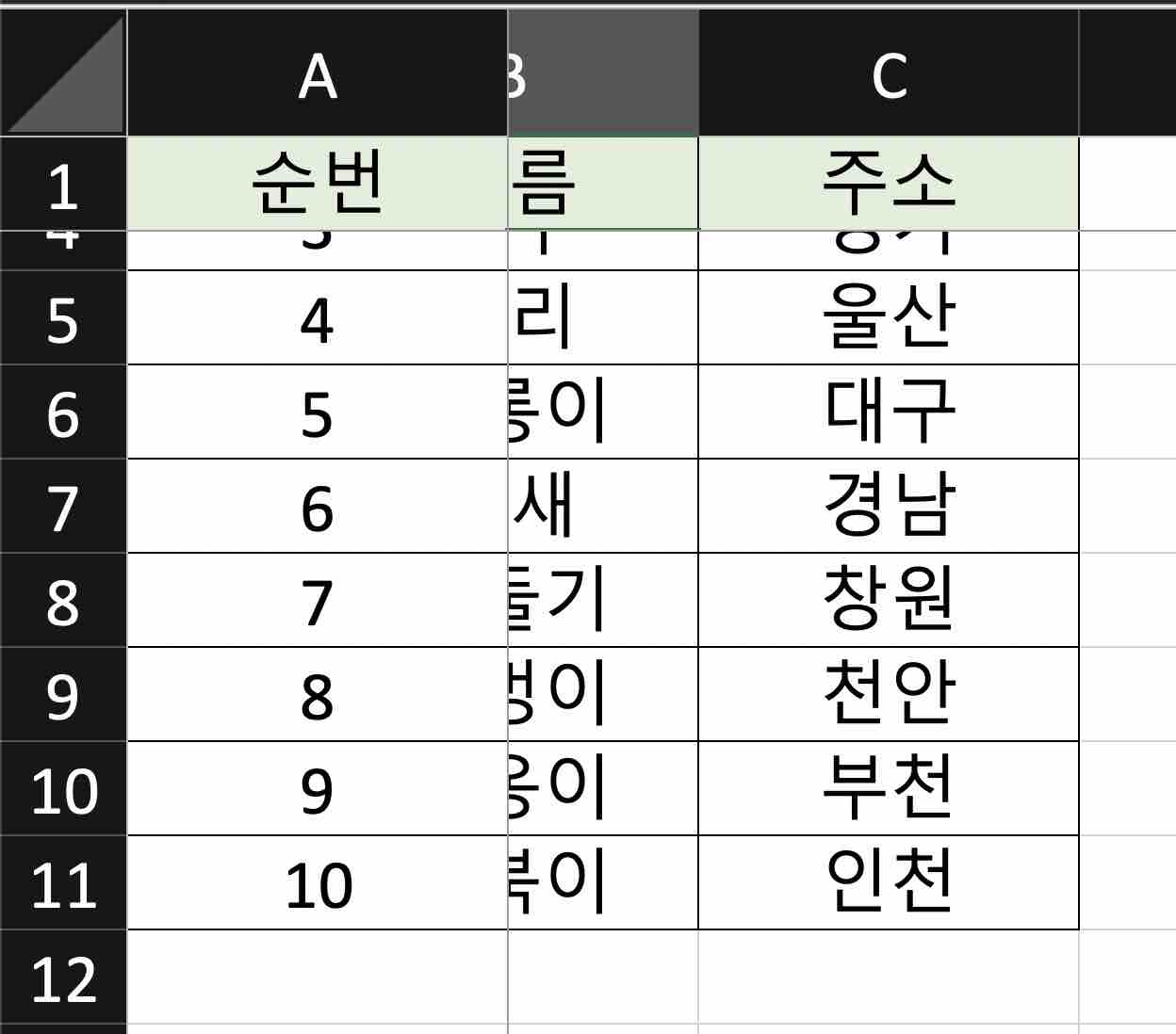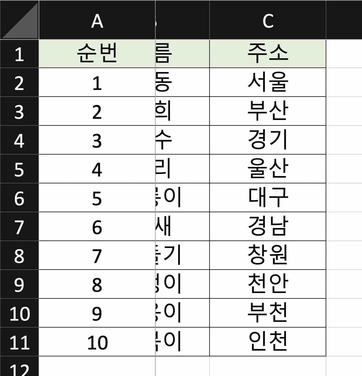 아래 예제용 테이블을 사용하여 틀 고정 기능을 익혀 보겠습니다.