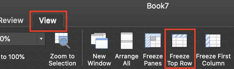 상단 메뉴에서 [보기(View)]를 누른 뒤 [첫 행 고정(Freeze Top Row)]를 누릅니다.