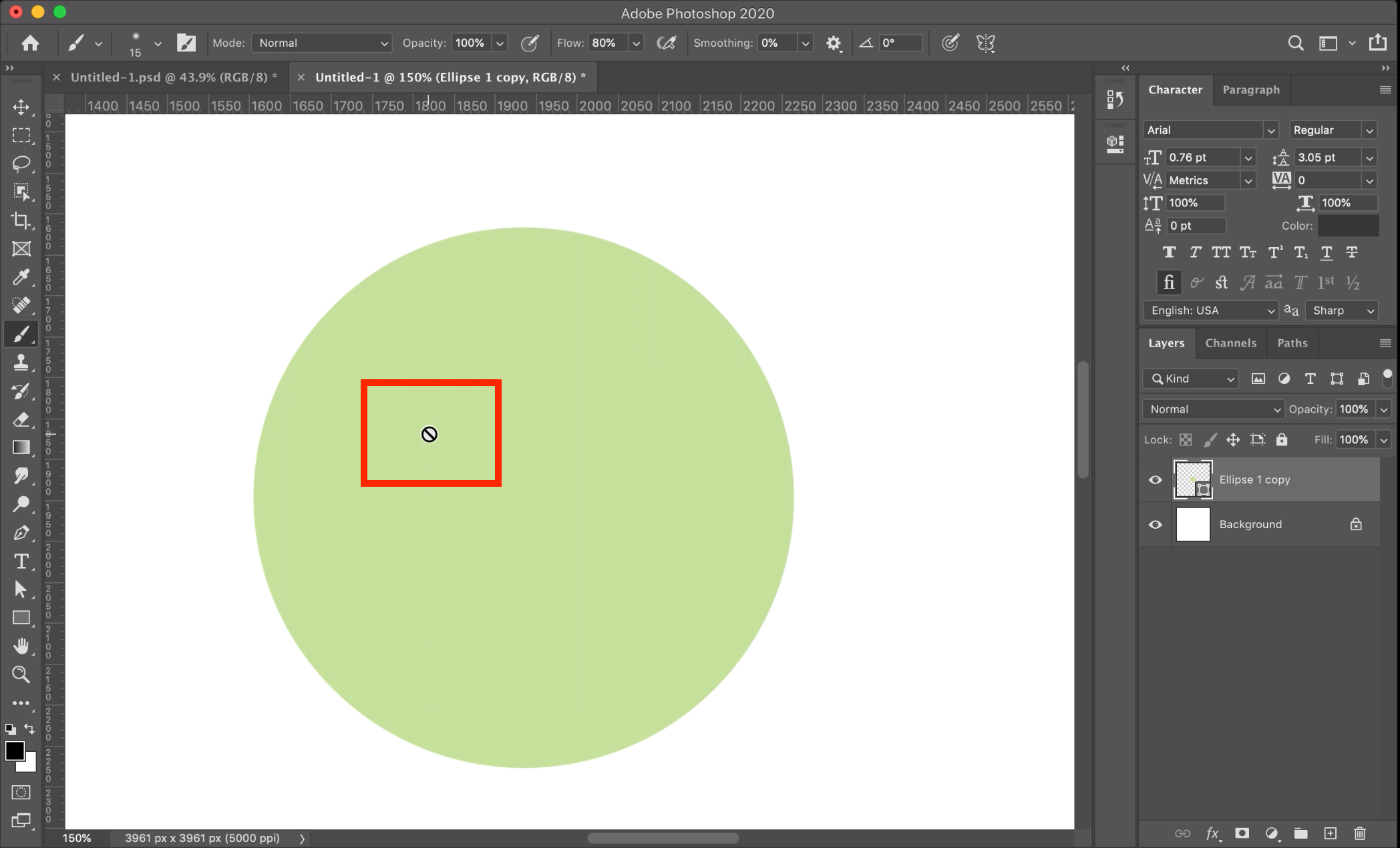 저는 지우개 툴로 'A'의 일부를 지웠습니다.