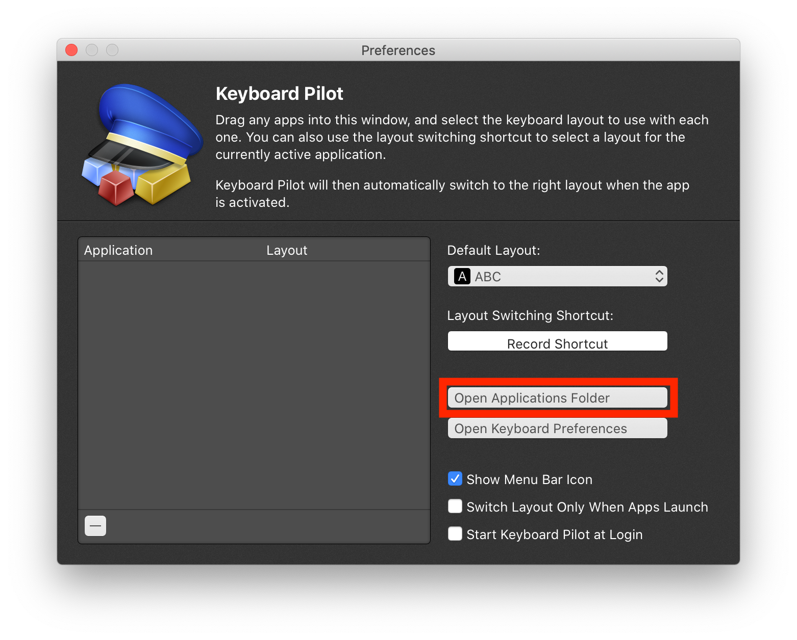 Keyboard Pilot은 앱스토어에서 무료로 받을 수 있는 앱입니다.(예전에는 $2.99에 판매했었습니다.) 이 앱을 다운로드 받고 실행하면 다음과 같은 화면이 나옵니다. [Open Application Folder]를 눌러서 앱이 위치한 디렉터리를 연 후에, 디폴트 입력 언어를 설정할 앱들을 하나씩 회색 영역으로 드래그합니다.