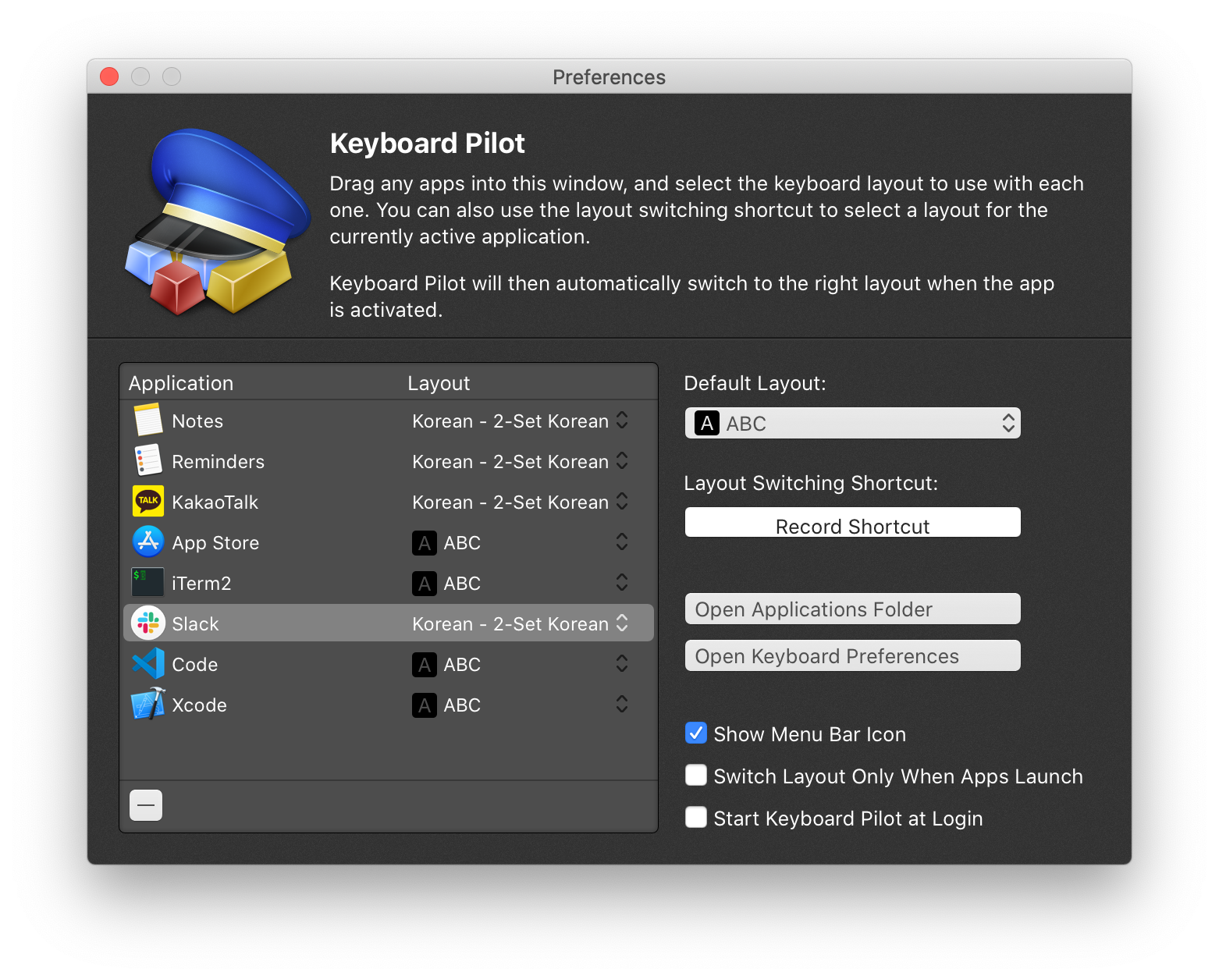 아래와 같이 앱이 추가되었다면 각 앱에 해당되는 [Layout]을 변경해 줍니다. 메모, 미리알림, 메신저 앱과 같이 한글을 자주 입력하는 앱일 경우에는 [Korean - 2-Set Korean]으로 바꿨고 개발 관련 툴이나 앱스토어 앱은 영문으로 고정해 놓았습니다.