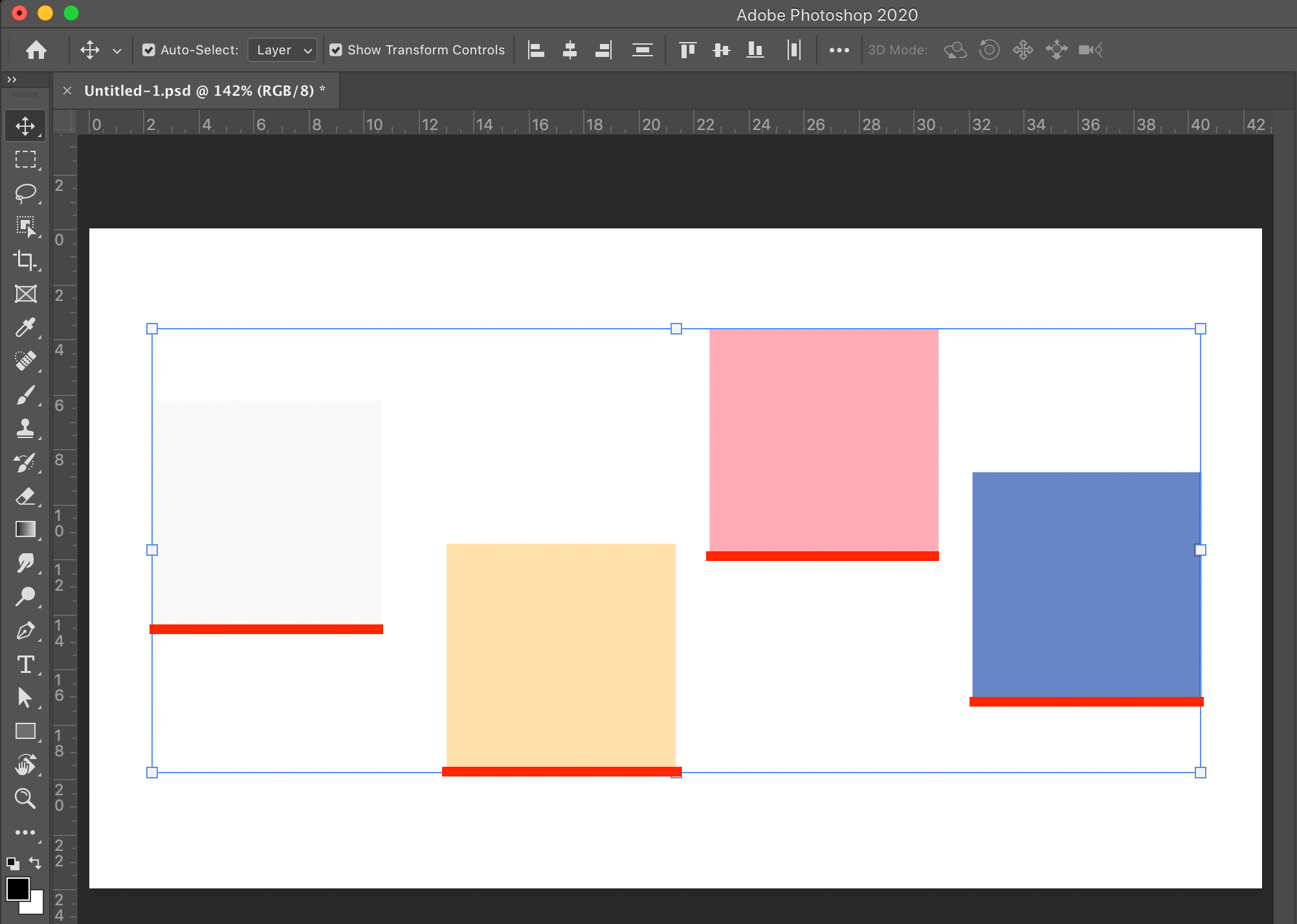 네 개의 레이어를 선택하고 [아래쪽 가장자리(Distribute bottom edges)]를 선택해 보겠습니다.