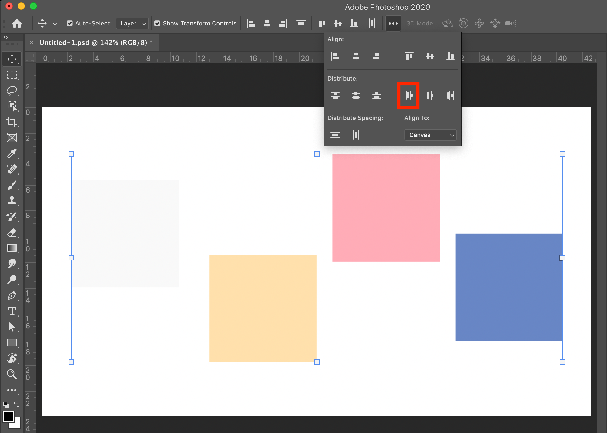 네 개의 레이어를 선택하고 [왼쪽 가장자리(Distribute left edges)]를 선택해 보겠습니다.