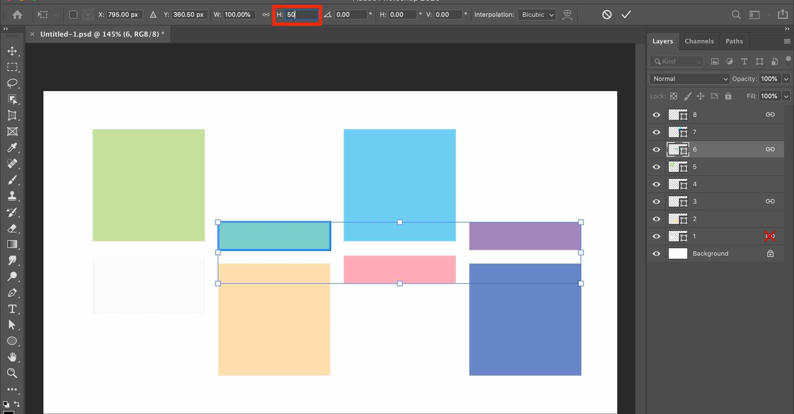 연결을 일시적으로 해제한 흰 정사각형 레이어를 제외하고, 나머지 레이어들의 세로 길이가 동시에 절반으로 줄어들었습니다.