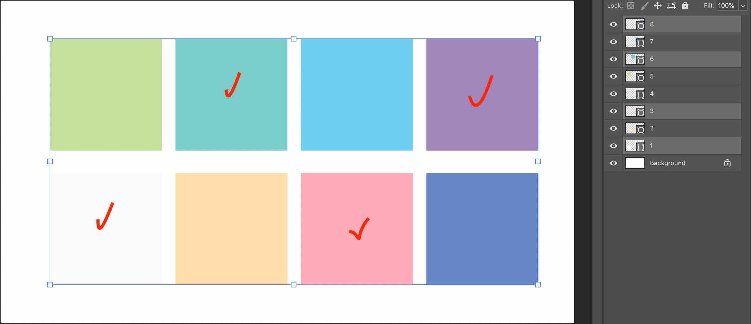 이제 선택한 레이어 중 하나(흰 정사각형)를 선택하고 이 레이어를 변형해 보겠습니다.