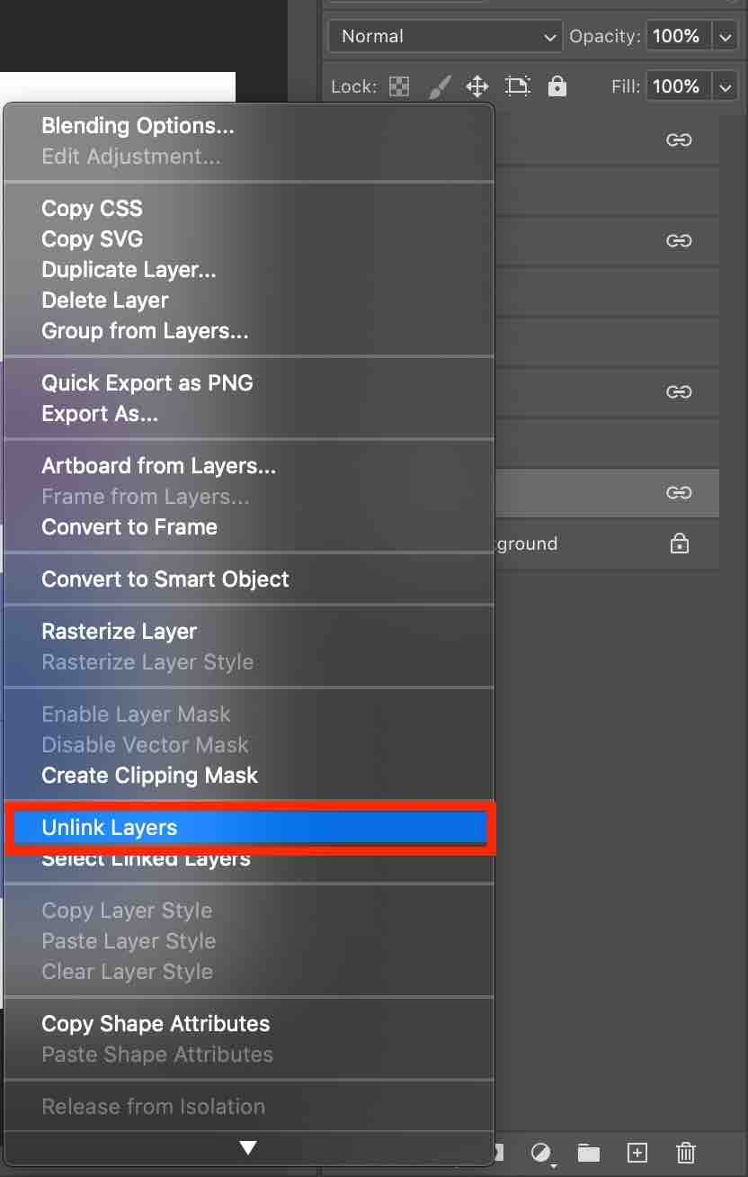 둘째, 레이어 패널에서 연결 해제하고자 하는 레이어를 선택하고 오른쪽 클릭을 한 뒤, [Unlink Layers]를 선택합니다.