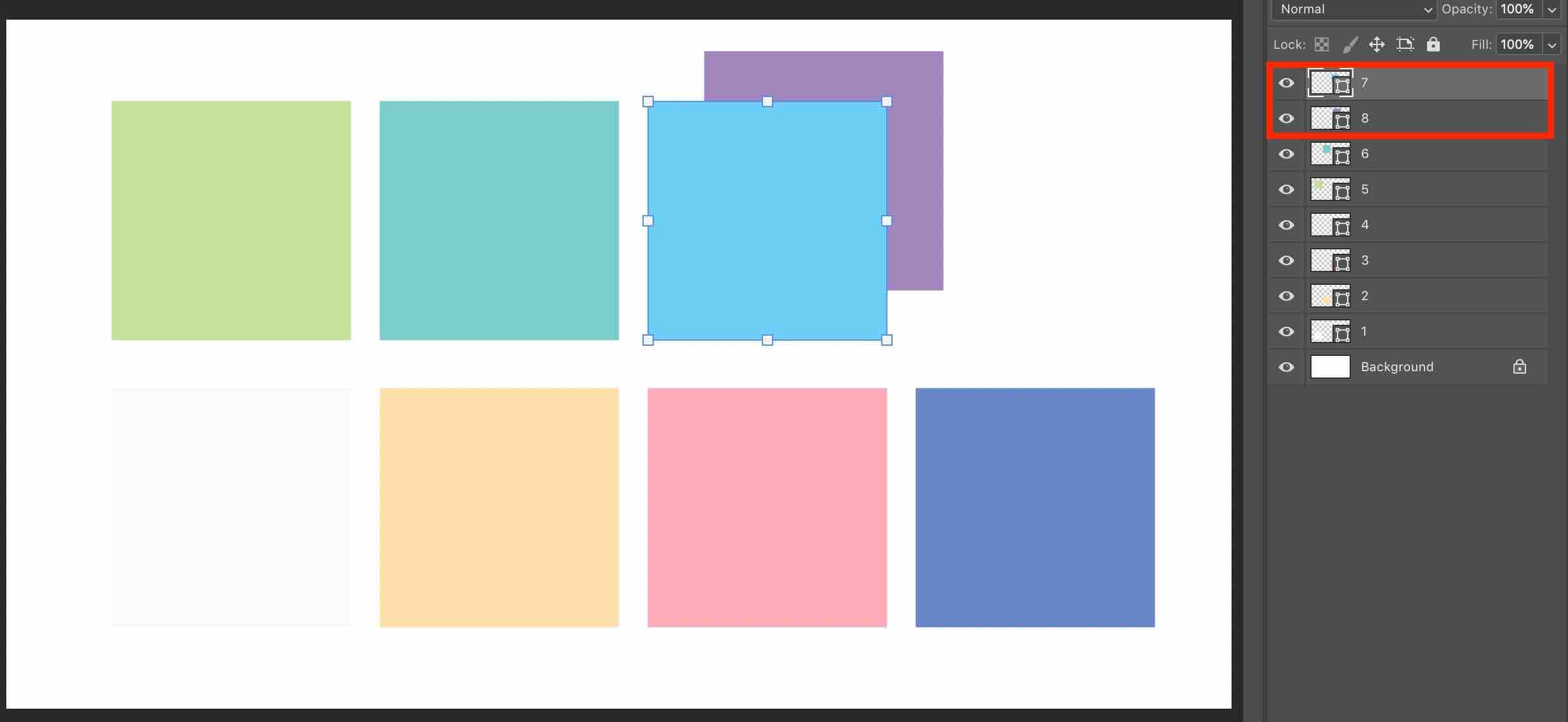 아래 예제에서 보라색 정사각형을 담고 있는 레이어 8은 파란색 정사각형을 담고 있는 레이어 7보다 위에 위치하므로, 보라색 정사각형이 파란색 정사각형을 덮고 있습니다.