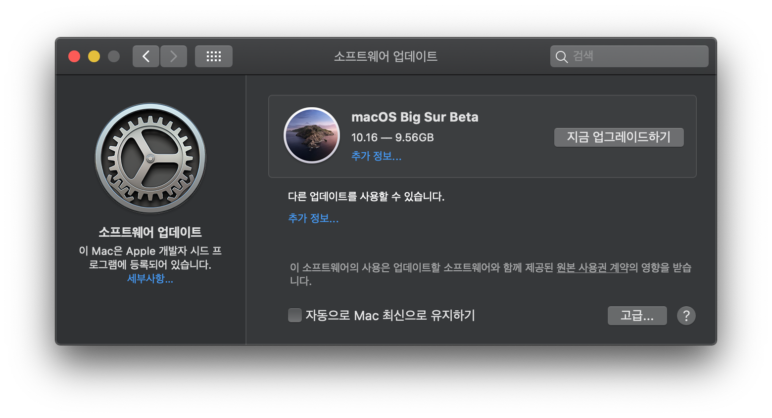 5. 설치를 마치면 [소프트웨어 업데이트] 창이 나타나며, 몇 초 기다리면 다음과 같이 macOS Big Sur Beta가 업데이트 목록에 표시됩니다. [지금 업그레이드하기]를 눌러서 설치 이미지를 다운로드 받습니다.