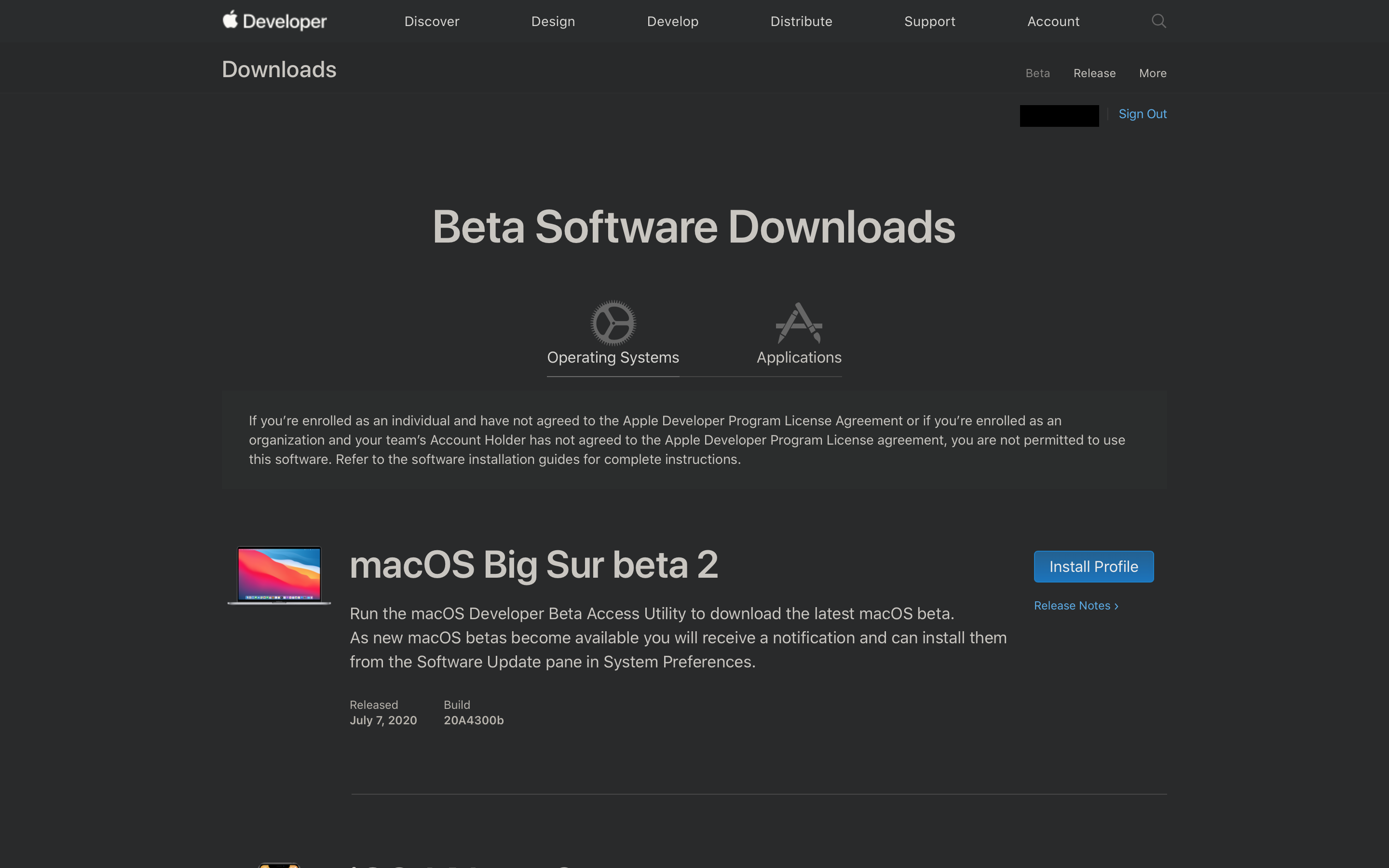 3. 현재 글 작성 시점 기준으로 빅 서 베타는 아직 퍼블릭 베타로 공개되어 있지 않기 때문에 개발자 계정이 필요합니다. developer.apple.com/download에서 빅 서 베타 소프트웨어 프로파일을 다운로드 받습니다. 만약 개발자 등록이 되어 있지 않다면 프로파일을 구글에서 검색해서 구하는 방법도 있습니다.