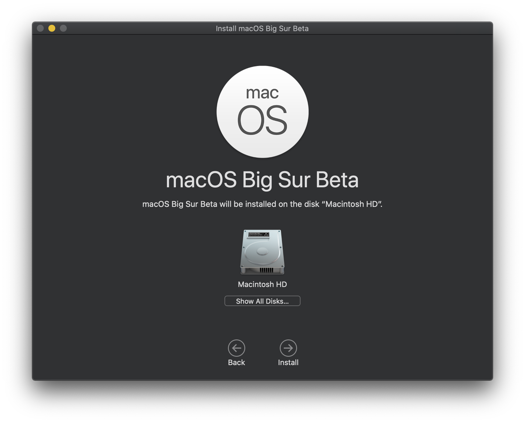 7. (중요) 아래 화면에서 [Show All Disks...]를 누르면 설치 가능한 볼륨 목록이 표시됩니다. 아까 [디스크 유틸리티]에서 새로 만들었던 볼륨을 선택한 뒤 [Install] 버튼을 누릅니다. 실수로 메인 볼륨에 설치하지 않도록 주의를 기울여야 합니다.