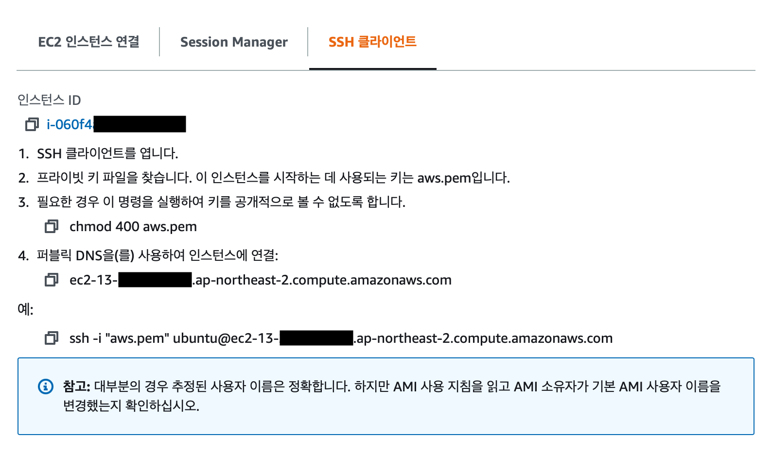 macOS나 리눅스를 사용 중이라면 터미널 셸에서 위의 ssh 명령어를 복사해서 사용합니다.(이 때 현재 경로는 *.pem 파일이 위치한 경로) 만약 사용 중인 컴퓨터에 SSH 클라이언트가 없다면 현재 사용 중인 운영 체제에서 프라이빗 키 파일을 사용해서 SSH 접속하는 방법을 구글에 검색해 보시기 바랍니다.